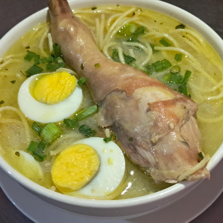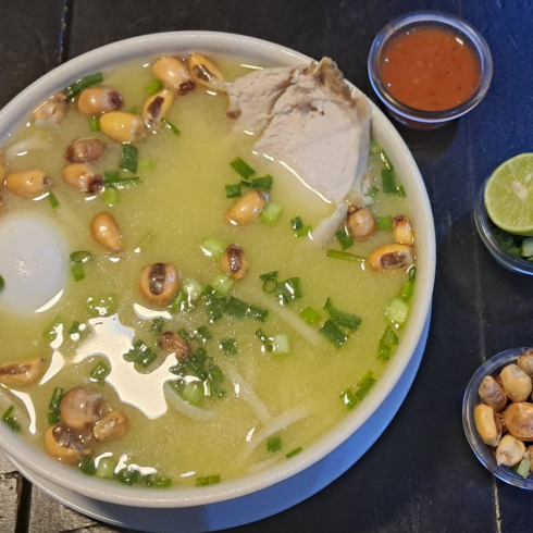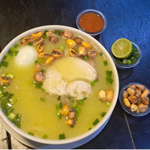 Caldo con Presa mediana de gallina + huevo + canchita, rocotito y cebolla china