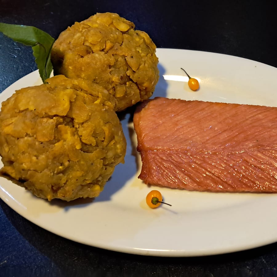 02 Bolas de Tacacho + Filete de Cecina acompañado de Ají de cocona. Sabor a Selva!
