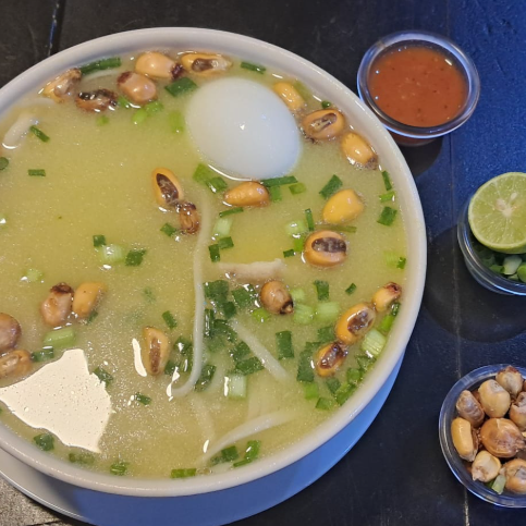 Caldo de gallina + huevo + canchita, rocotito y cebolla china