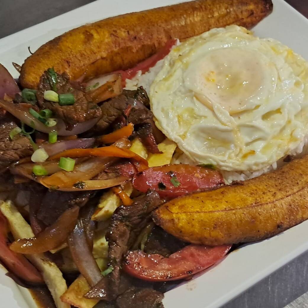 Lomo saltado de carne de res, acompañado de huevo frito, plátano frito y papas fritas.