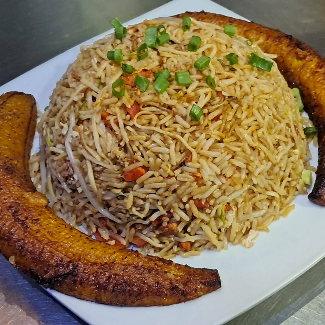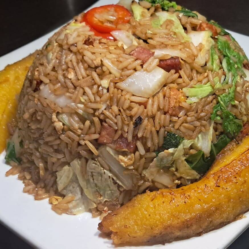 Chaufa a base de cecina, chorizo regional y verduras frescas, acompañado de plátano frito y ají de cocona