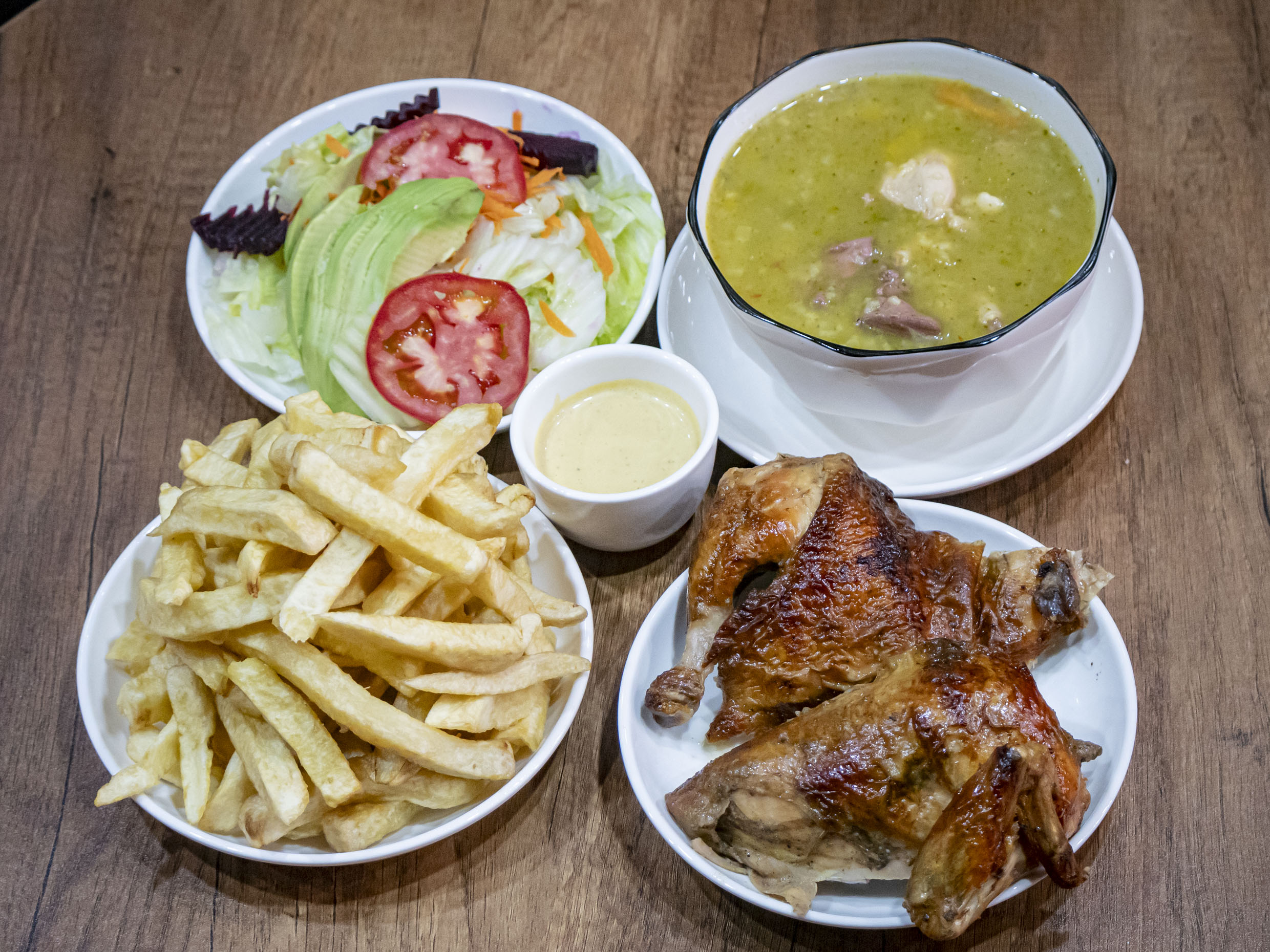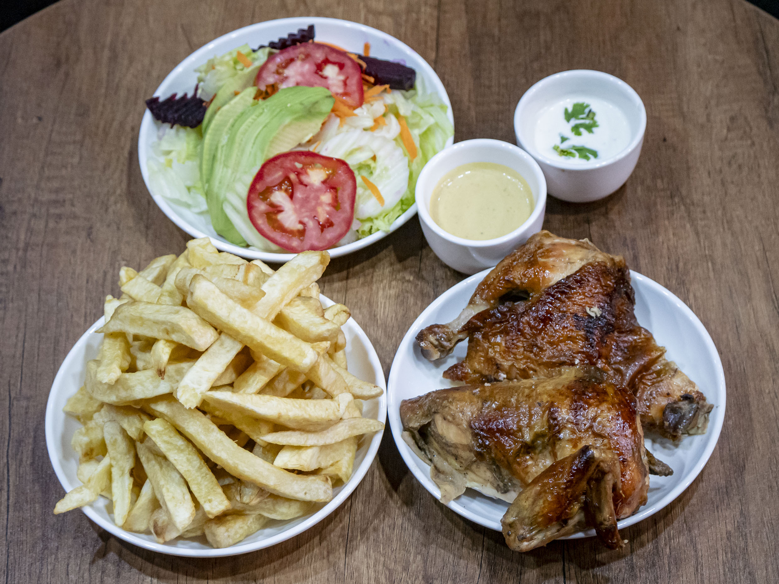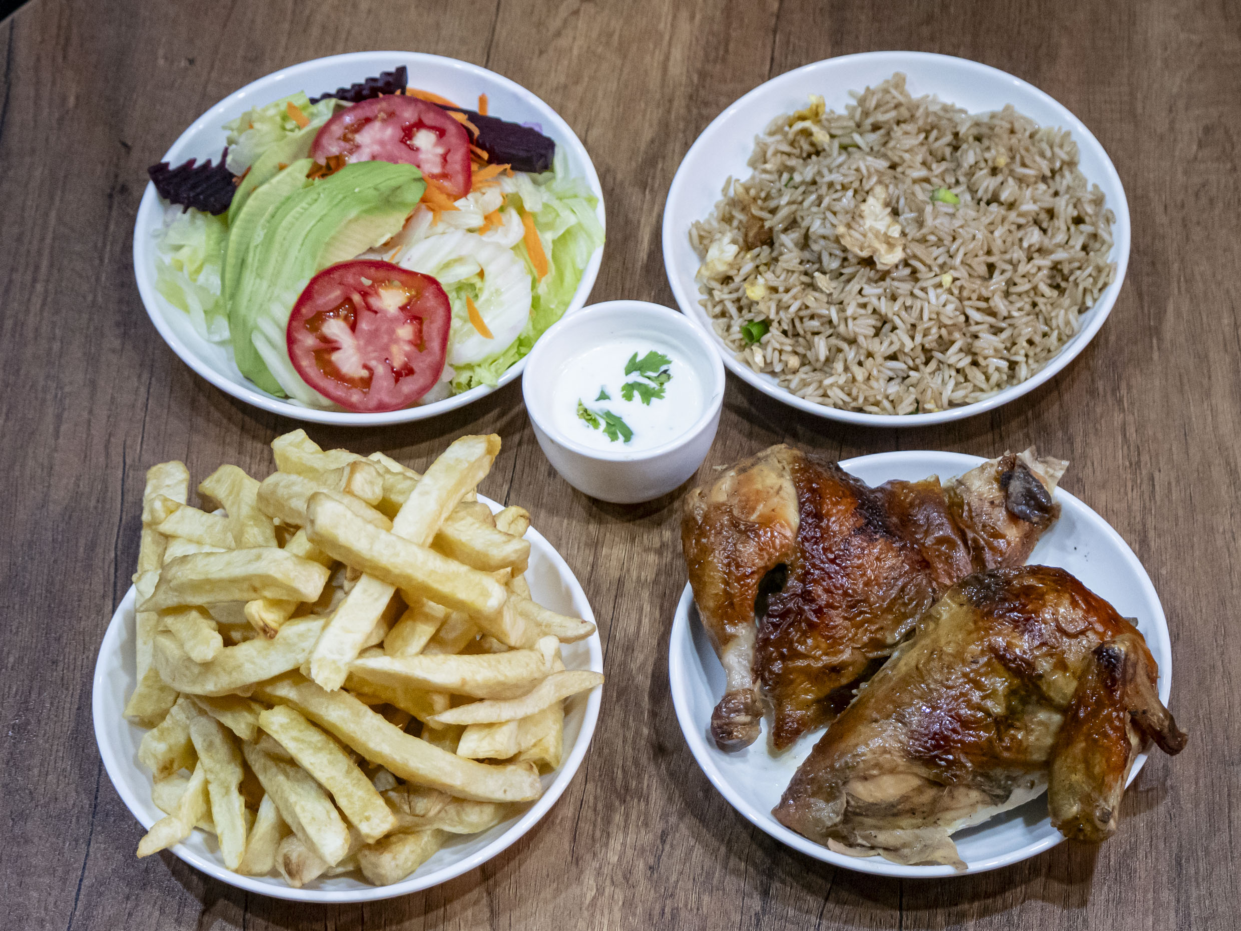 Pollo entero más papa frita más chaufa más ensalada y cremas.