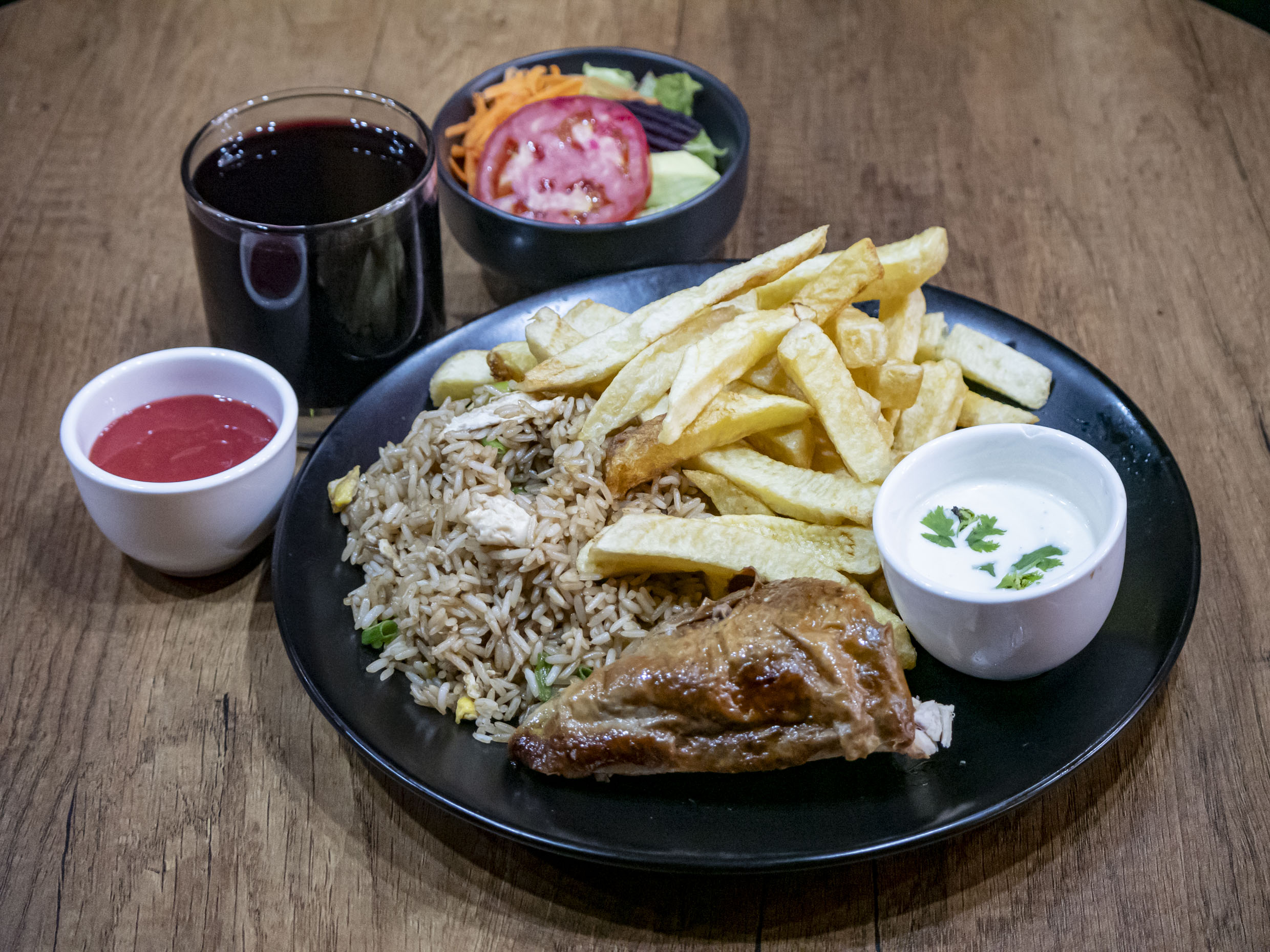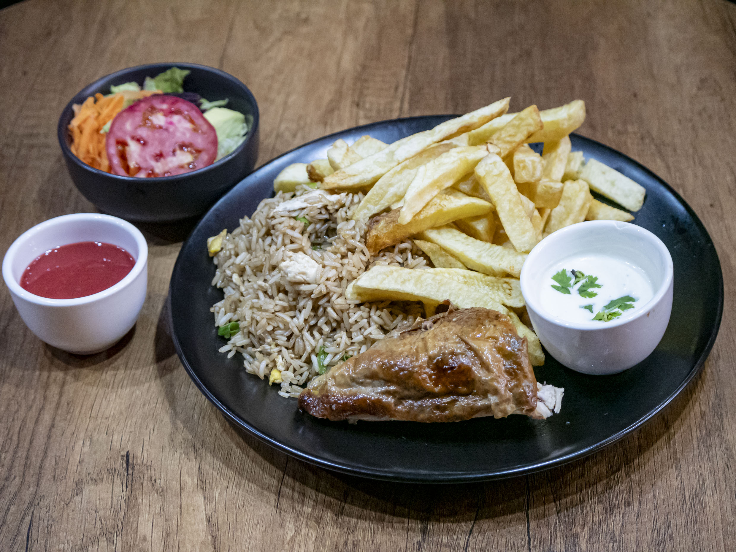 Chaufa, papa frita, 1/8 pollo ,ensalada y cremas.