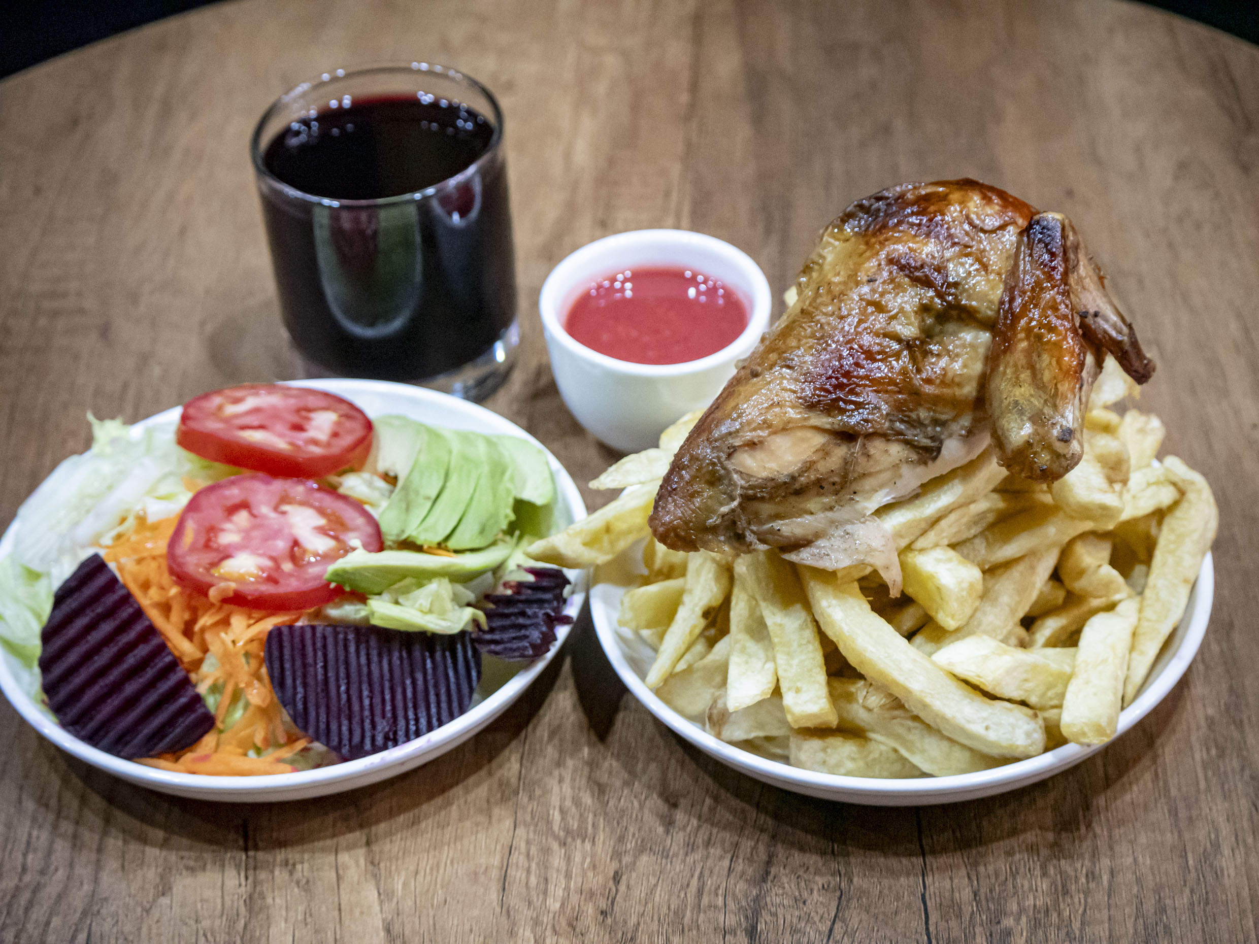 Medio pollo con papas fritas más chicha natural.