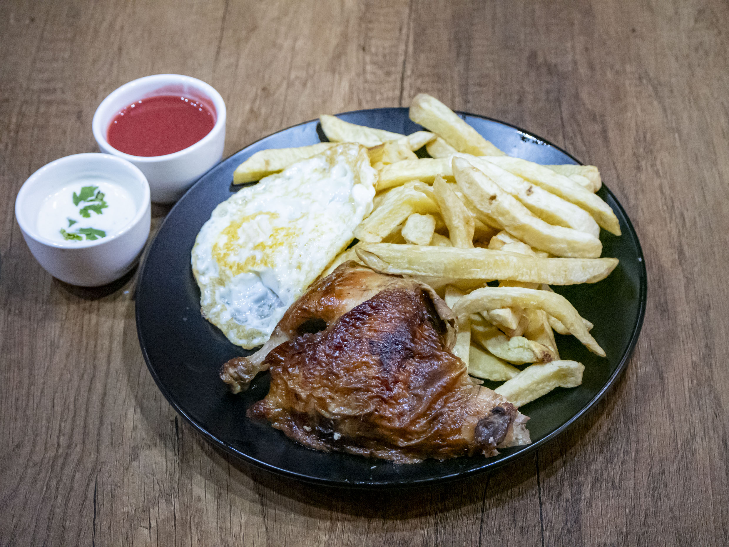 1/4 De pollo con papas fritas más huevo frito (presa disponibilidad de tienda).