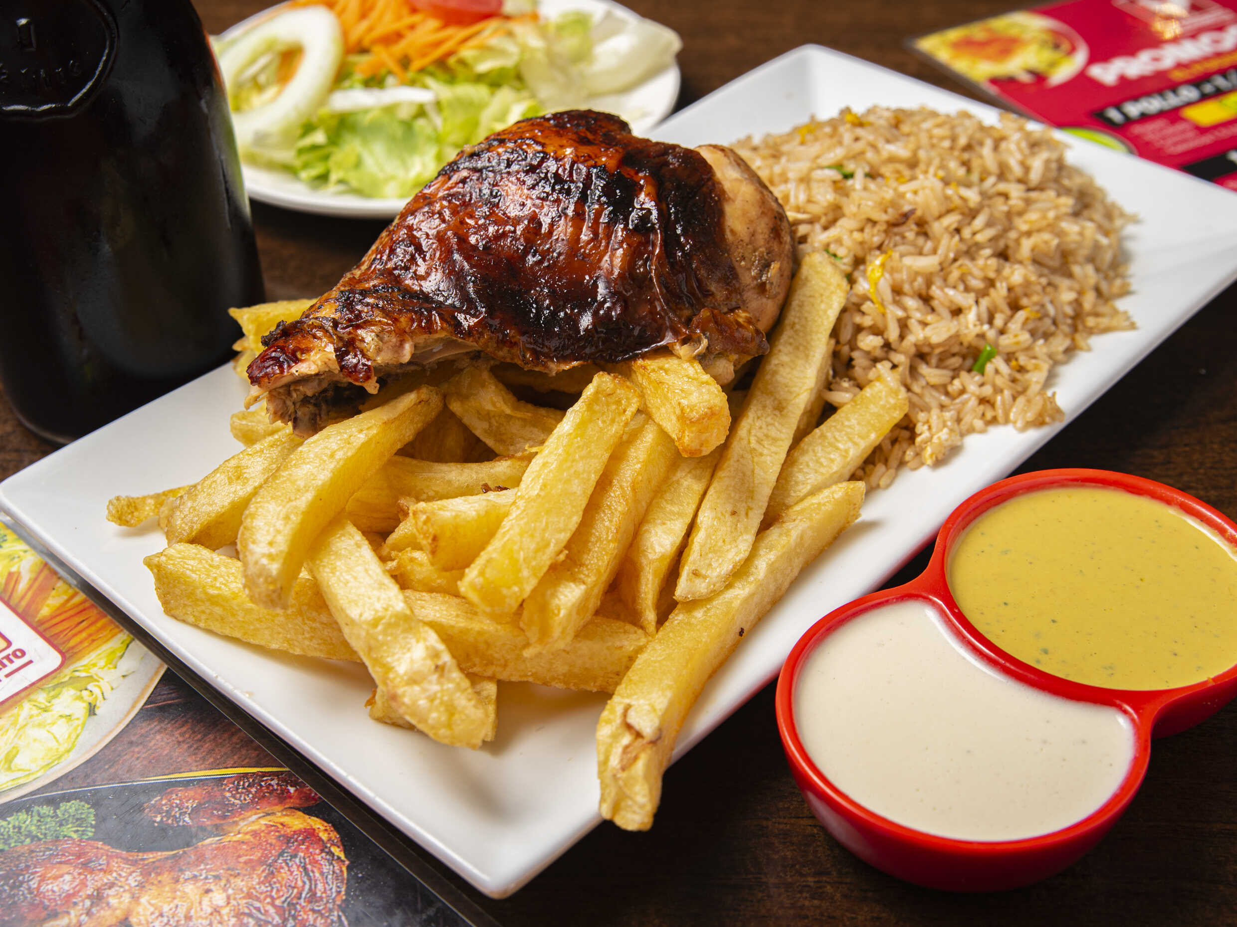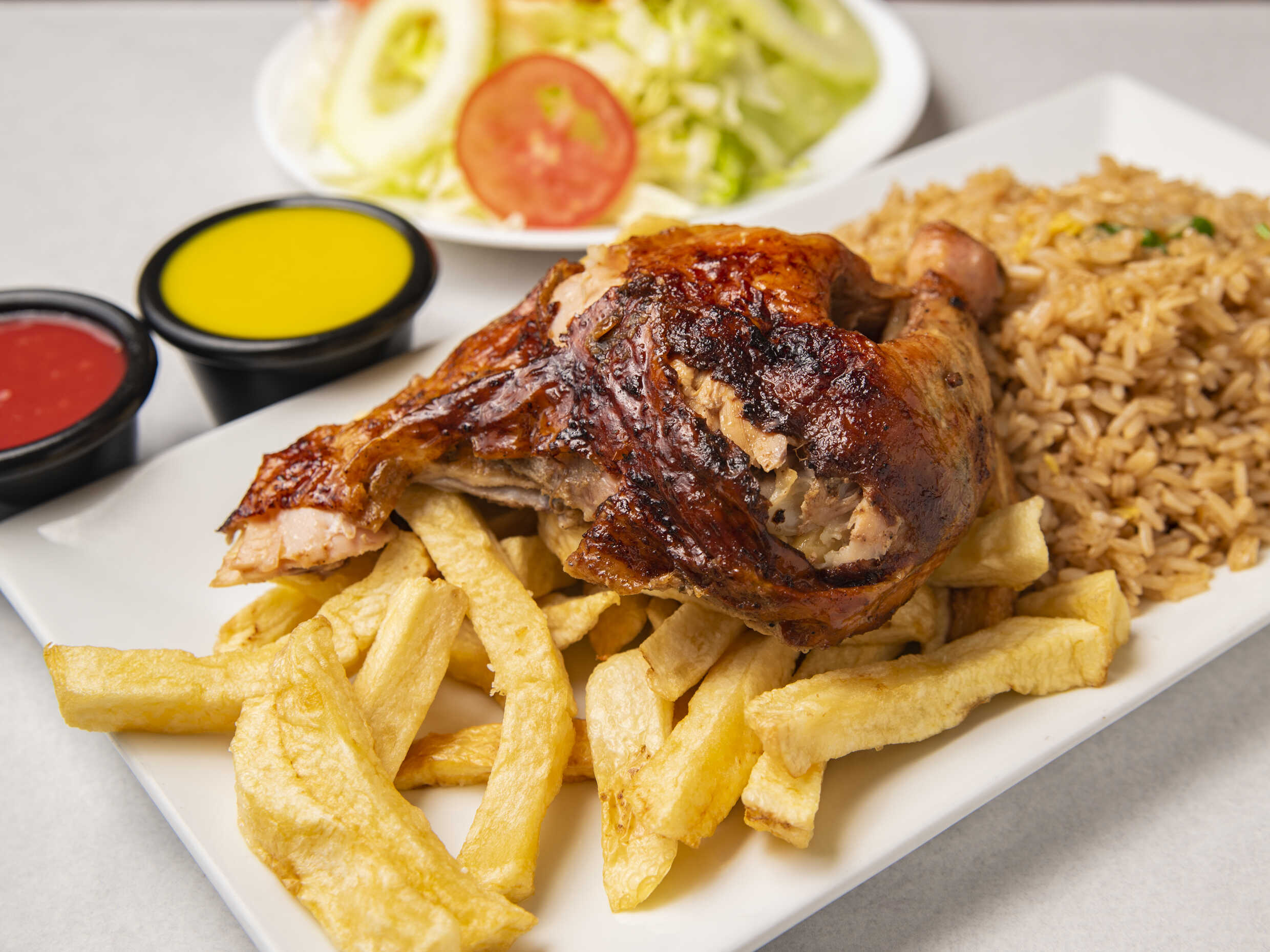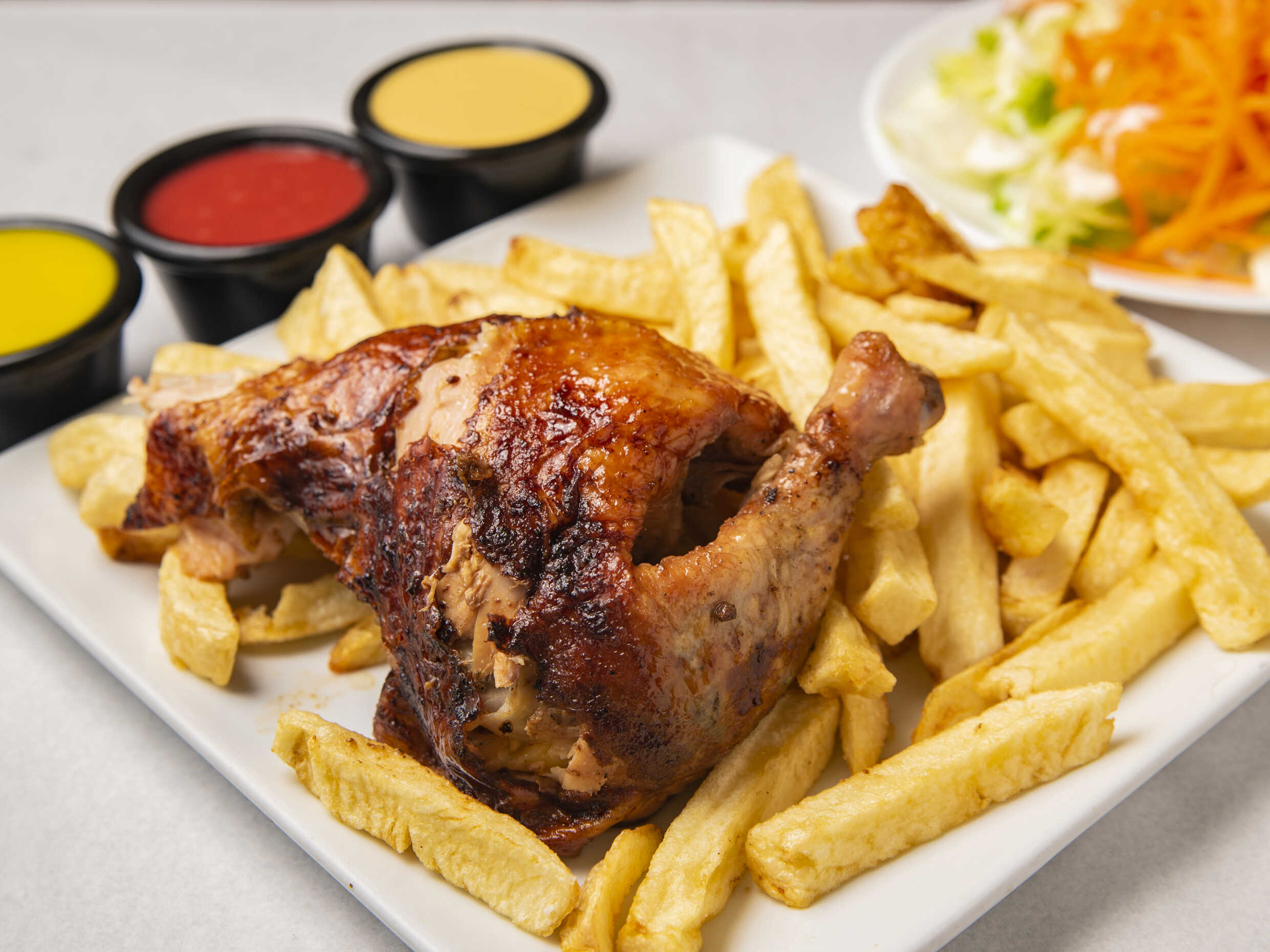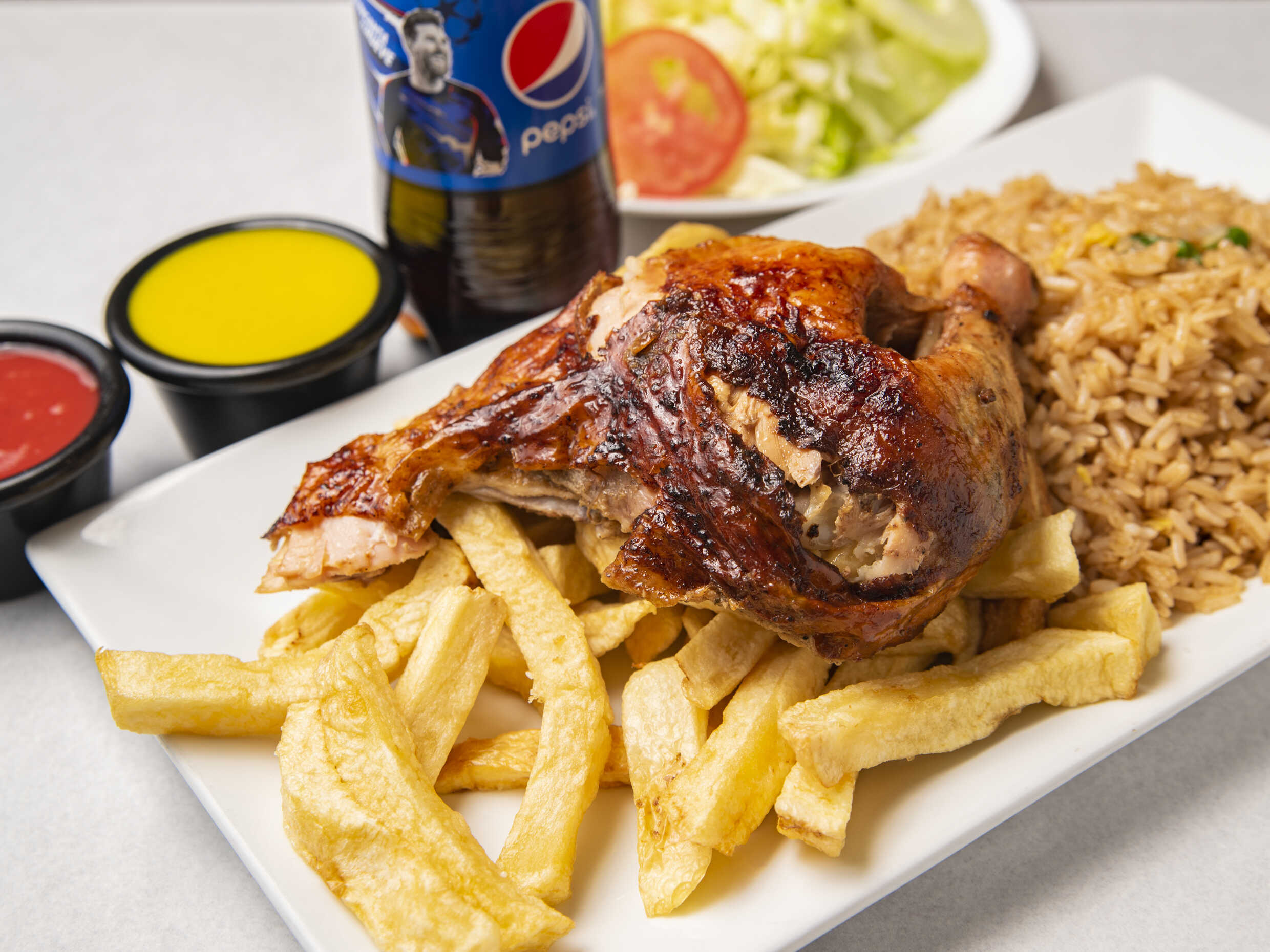 1/4 pollo a la brasa (a elección), papas fritas, ensalada y arroz chaufa.