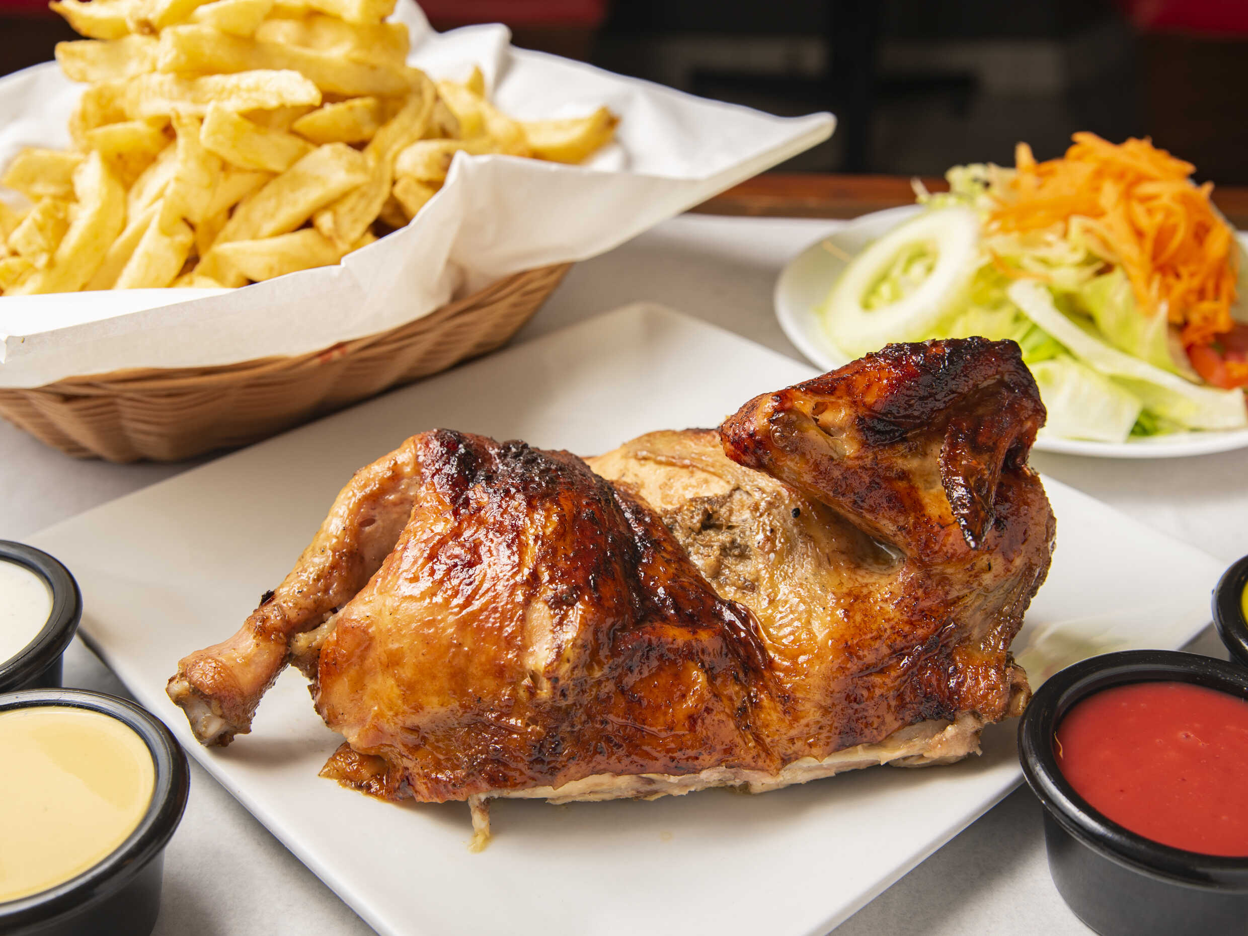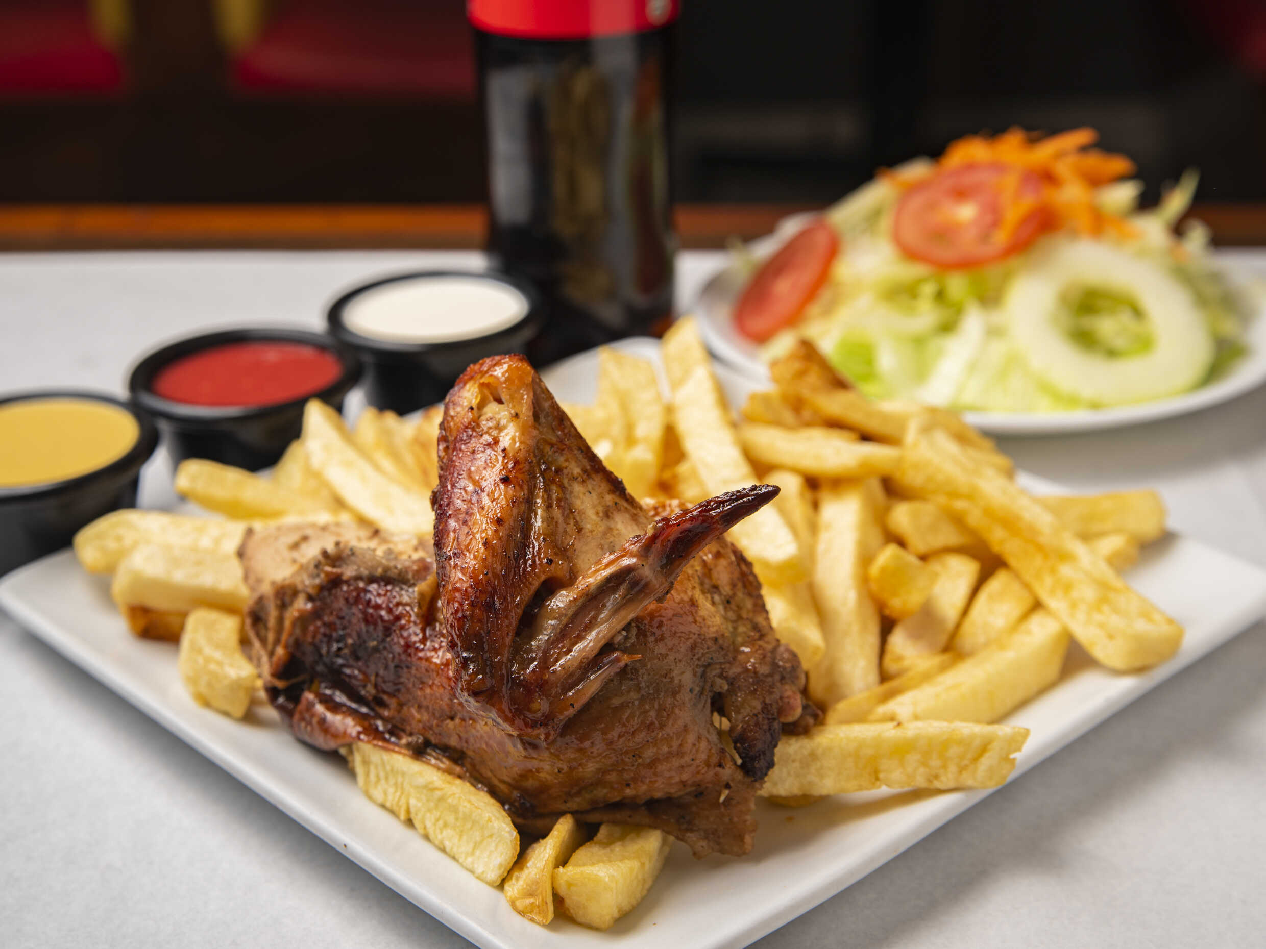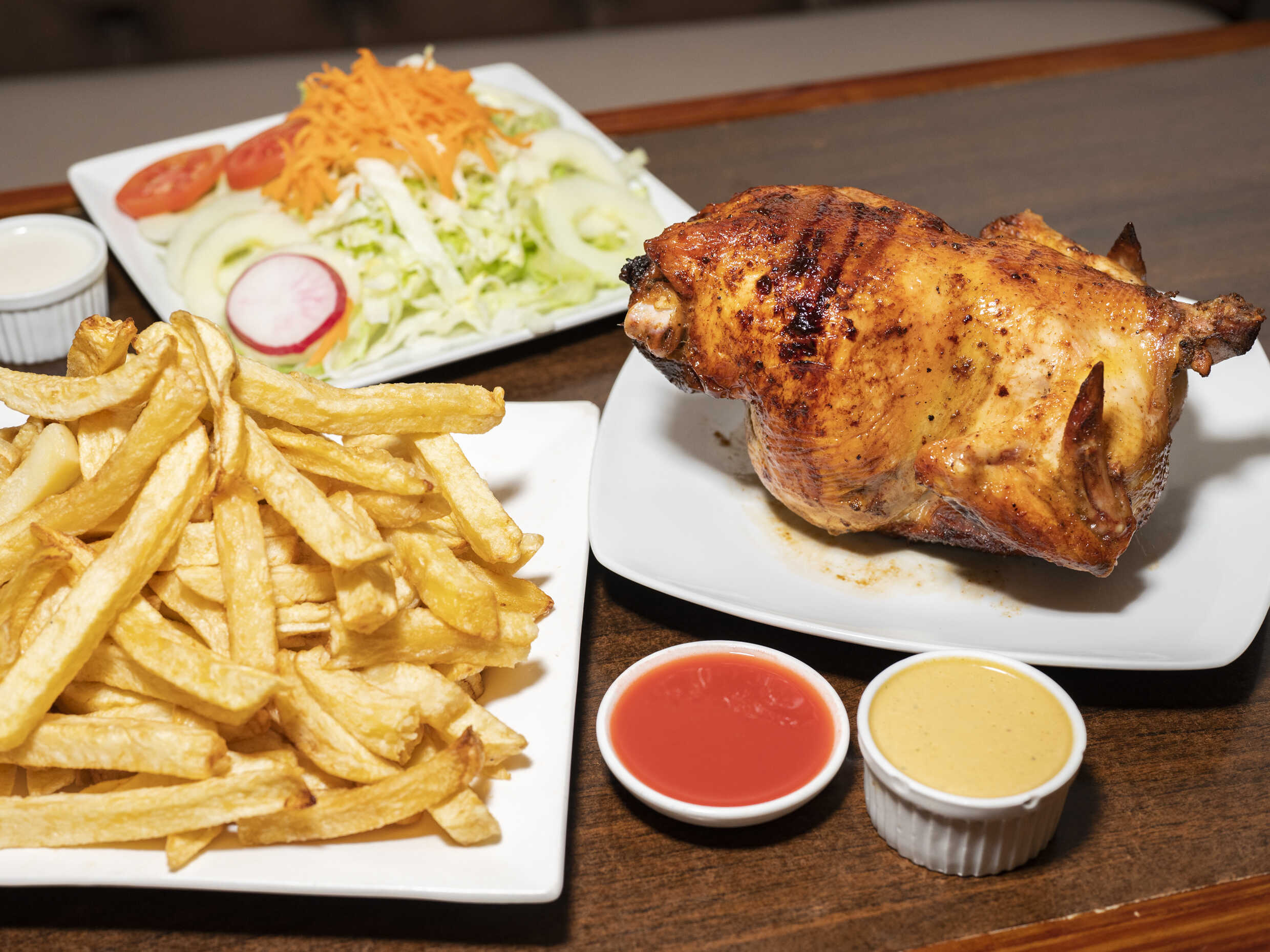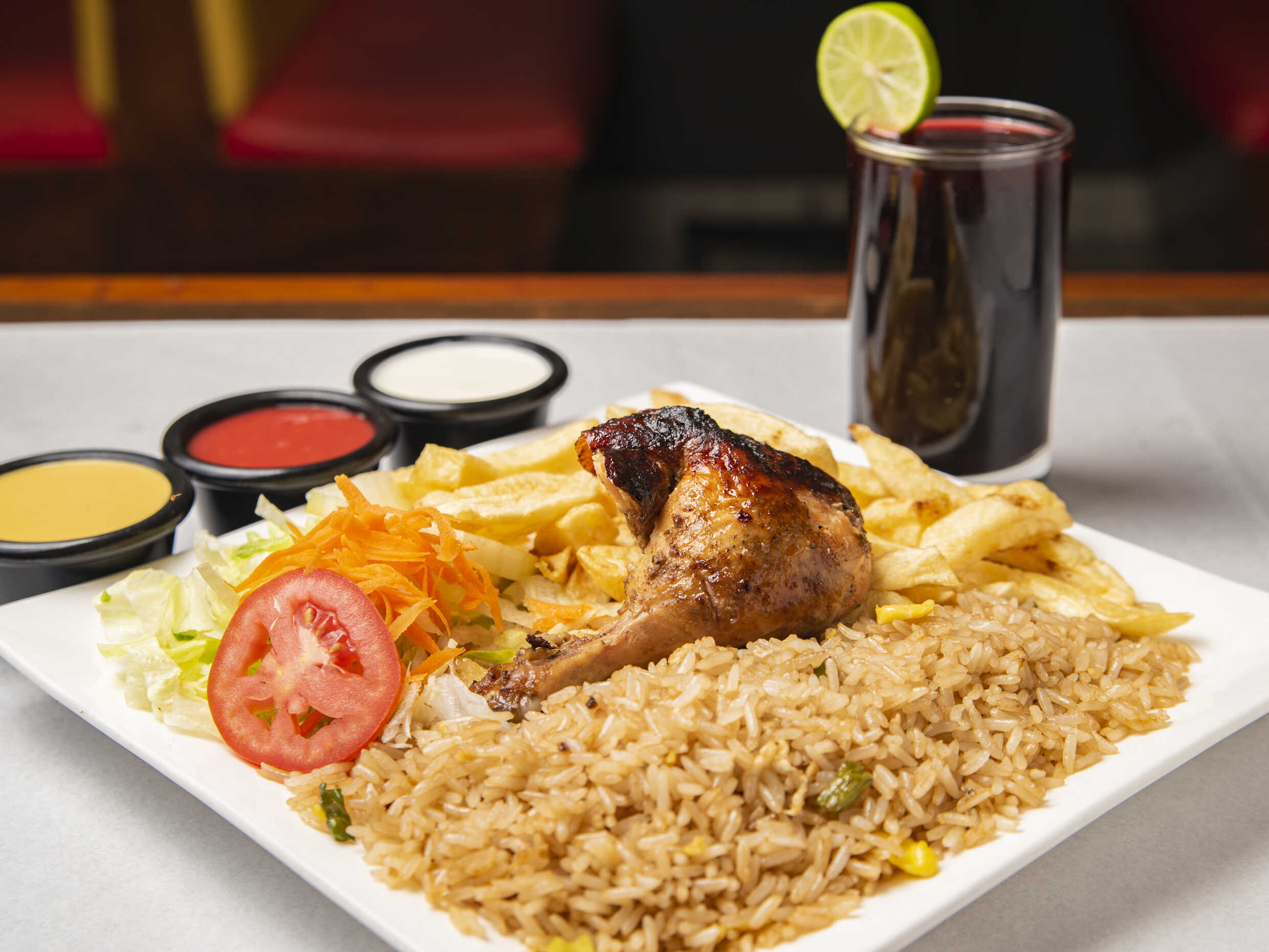 1/4 pollo a la brasa (a elección), papas fritas, ensalada y arroz chaufa.