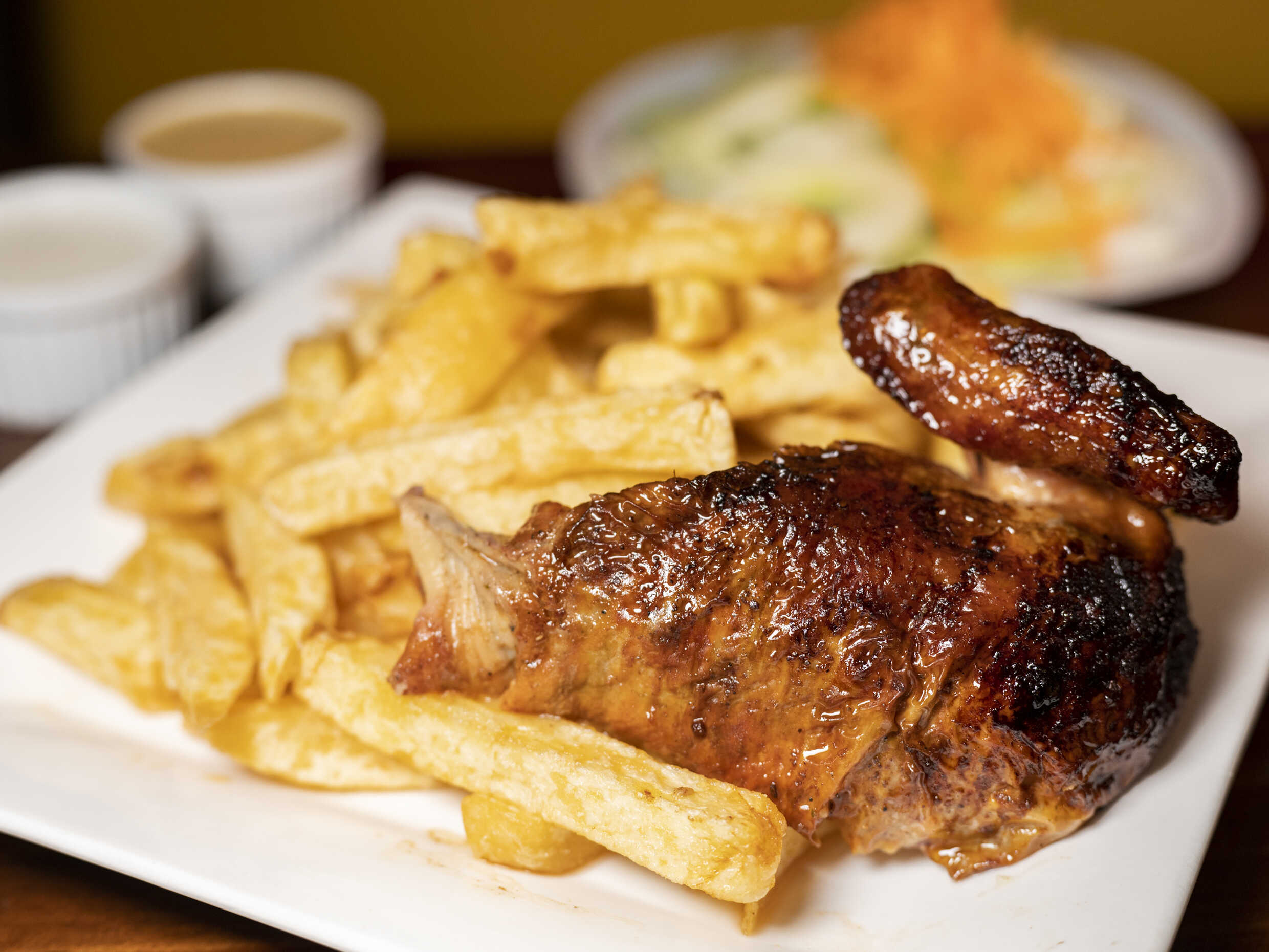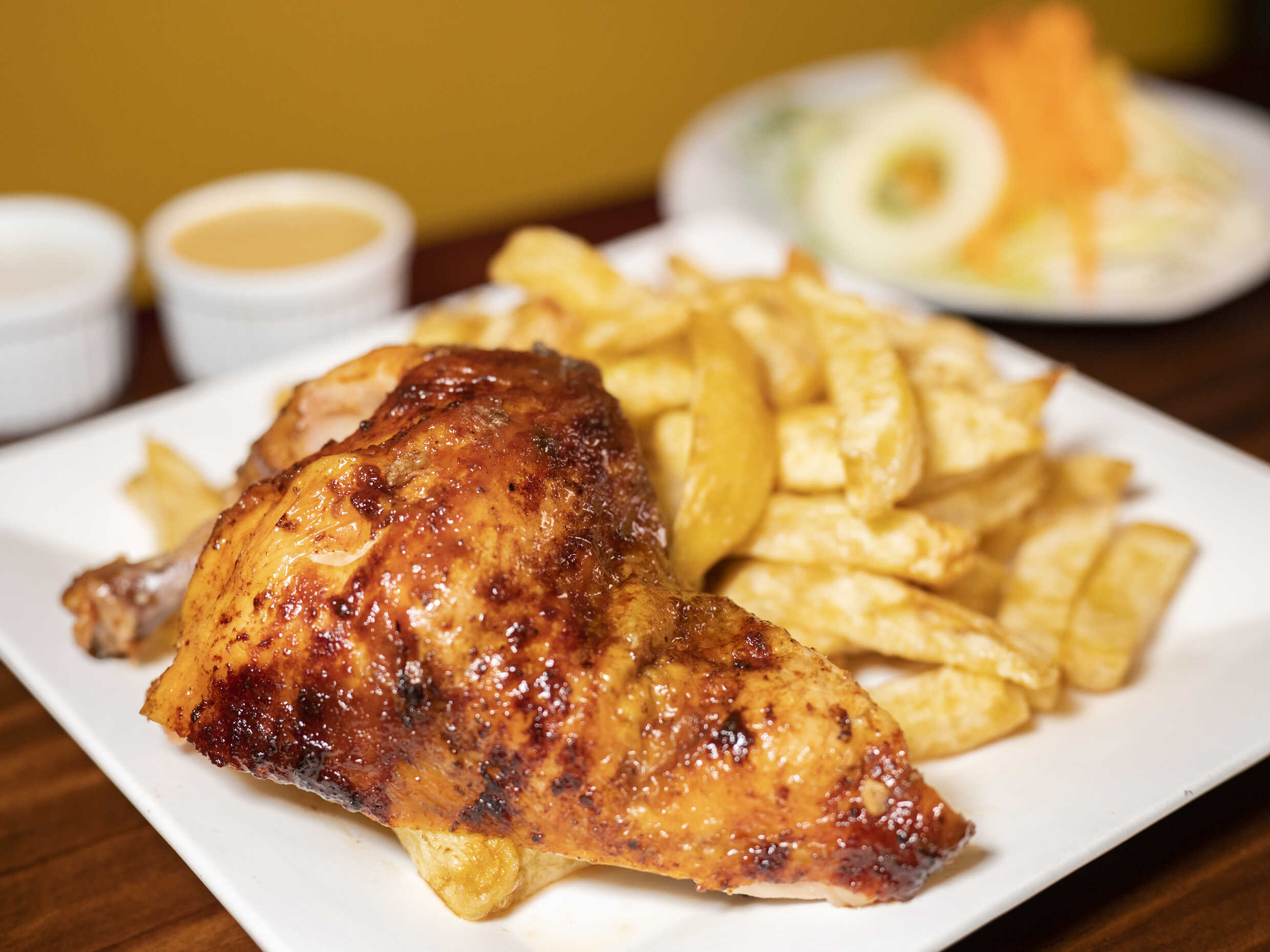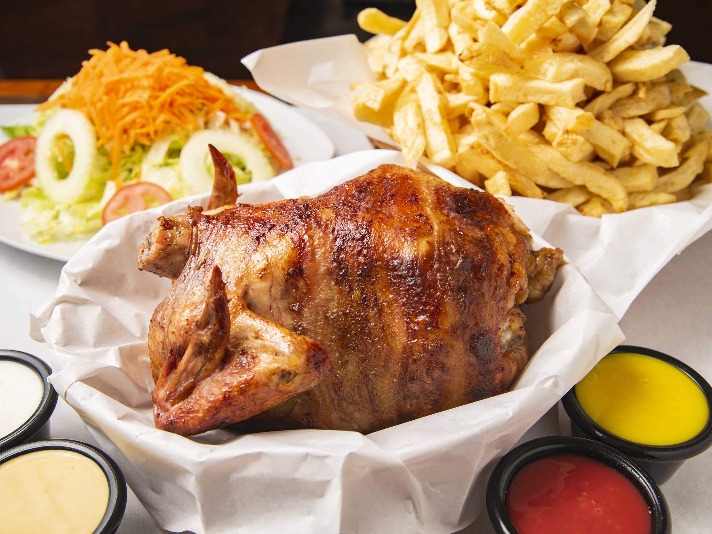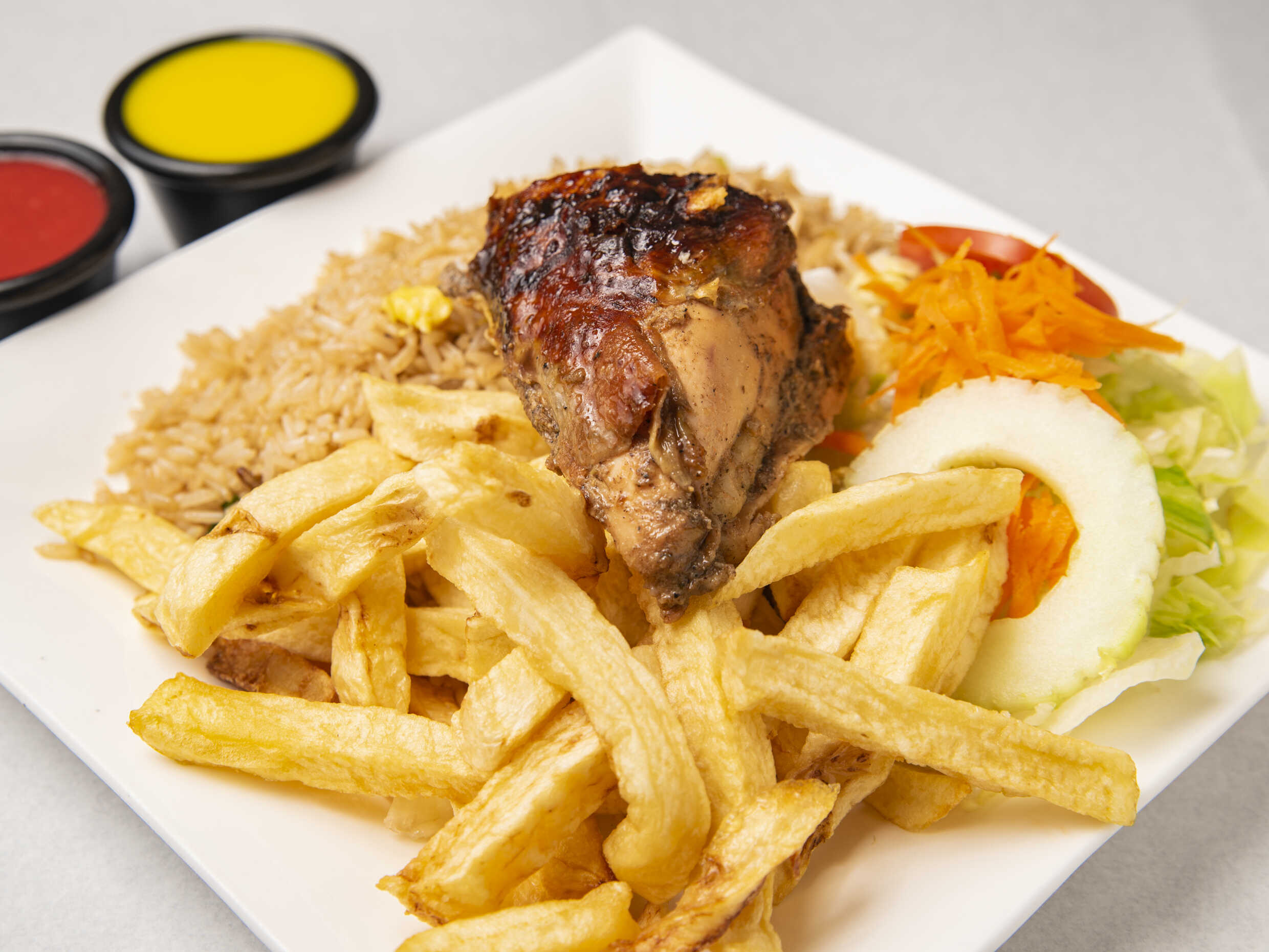 1/4 pollo a la brasa (a elección), papas fritas, ensalada y arroz chaufa.