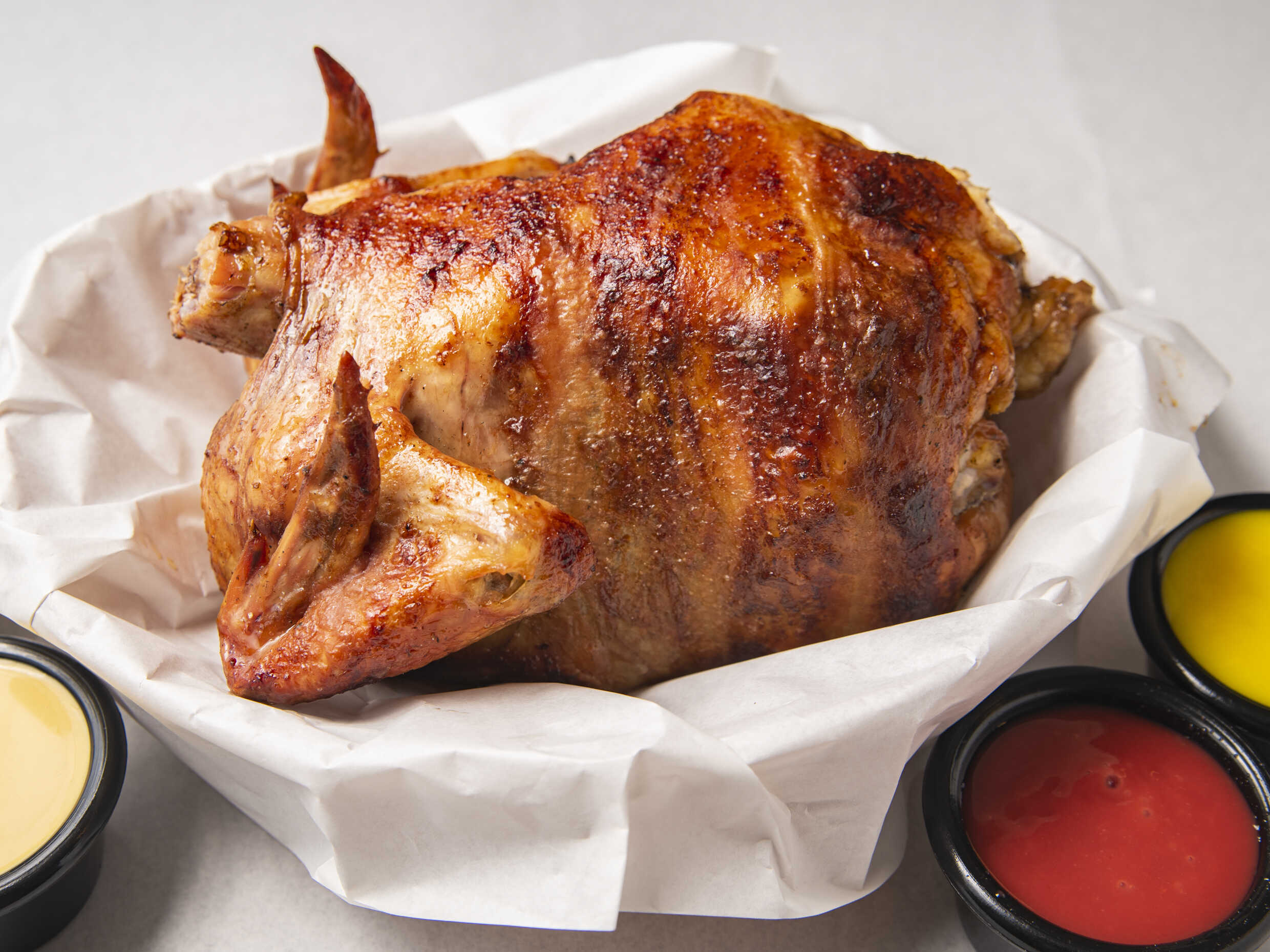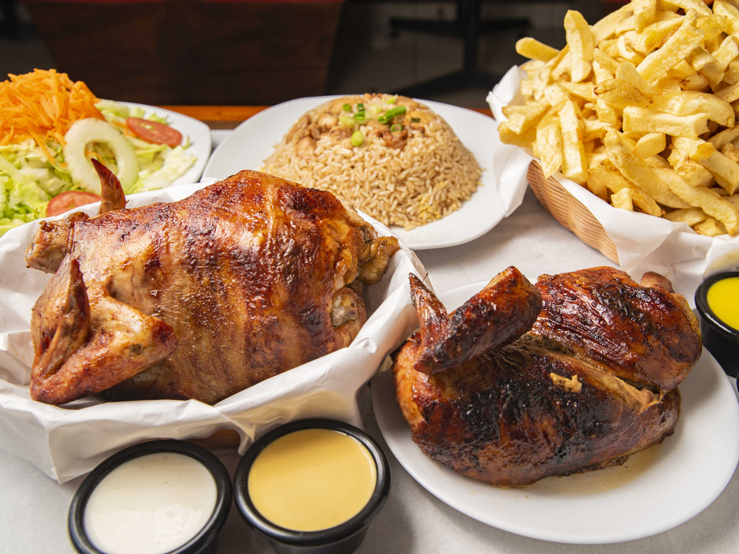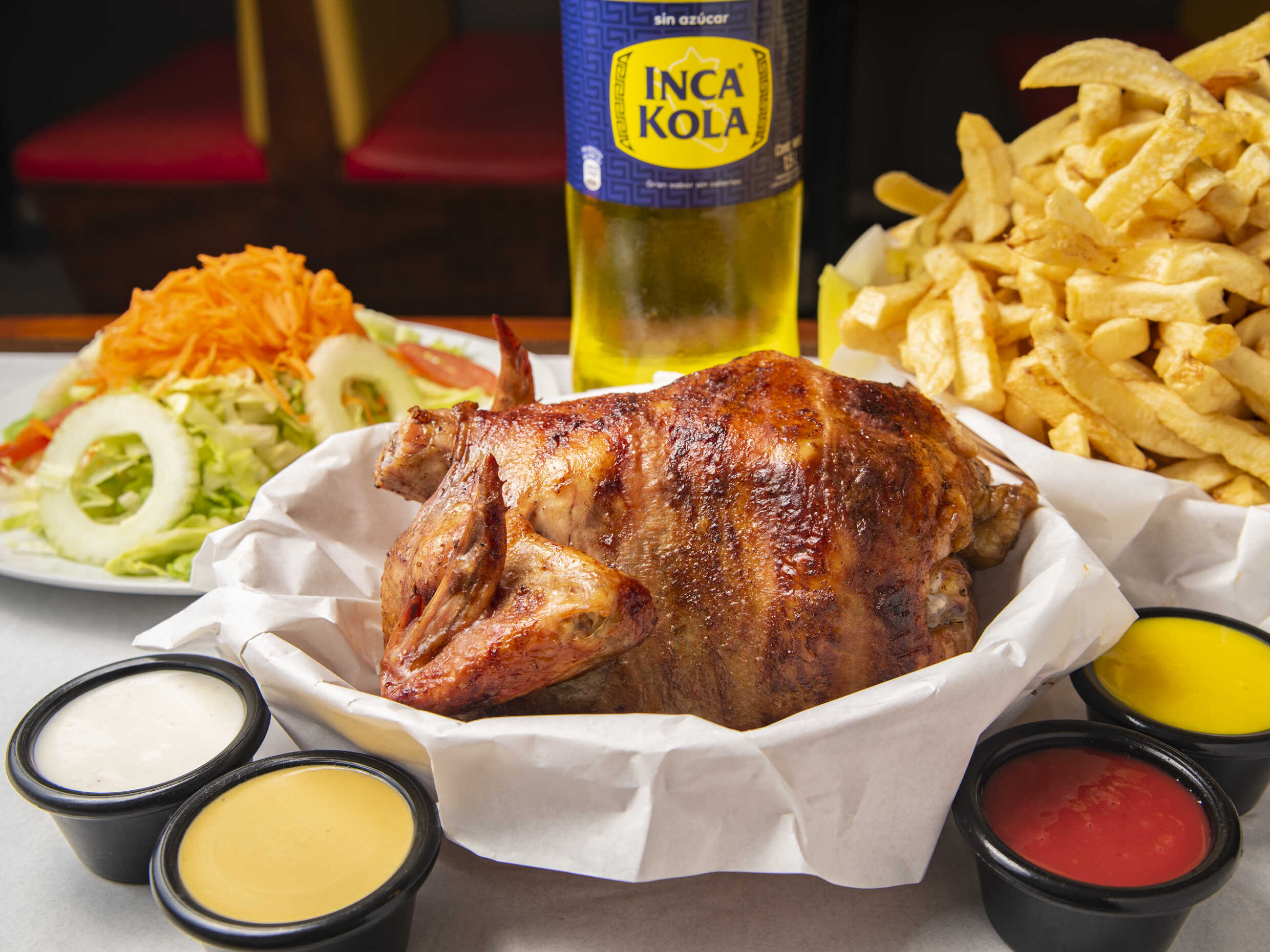 Pollo entero+ papa frita + chaufa+ ensalada y cremas.