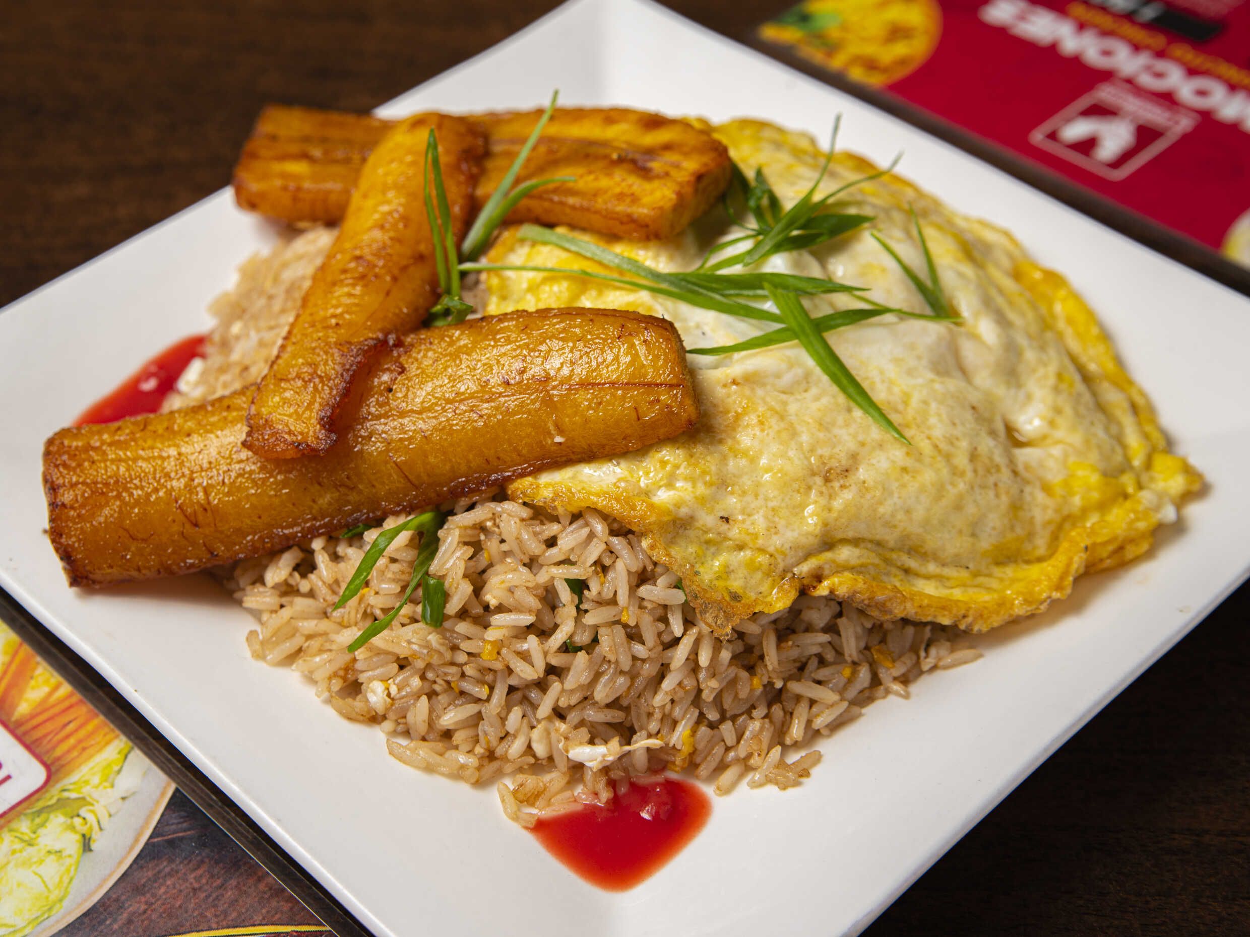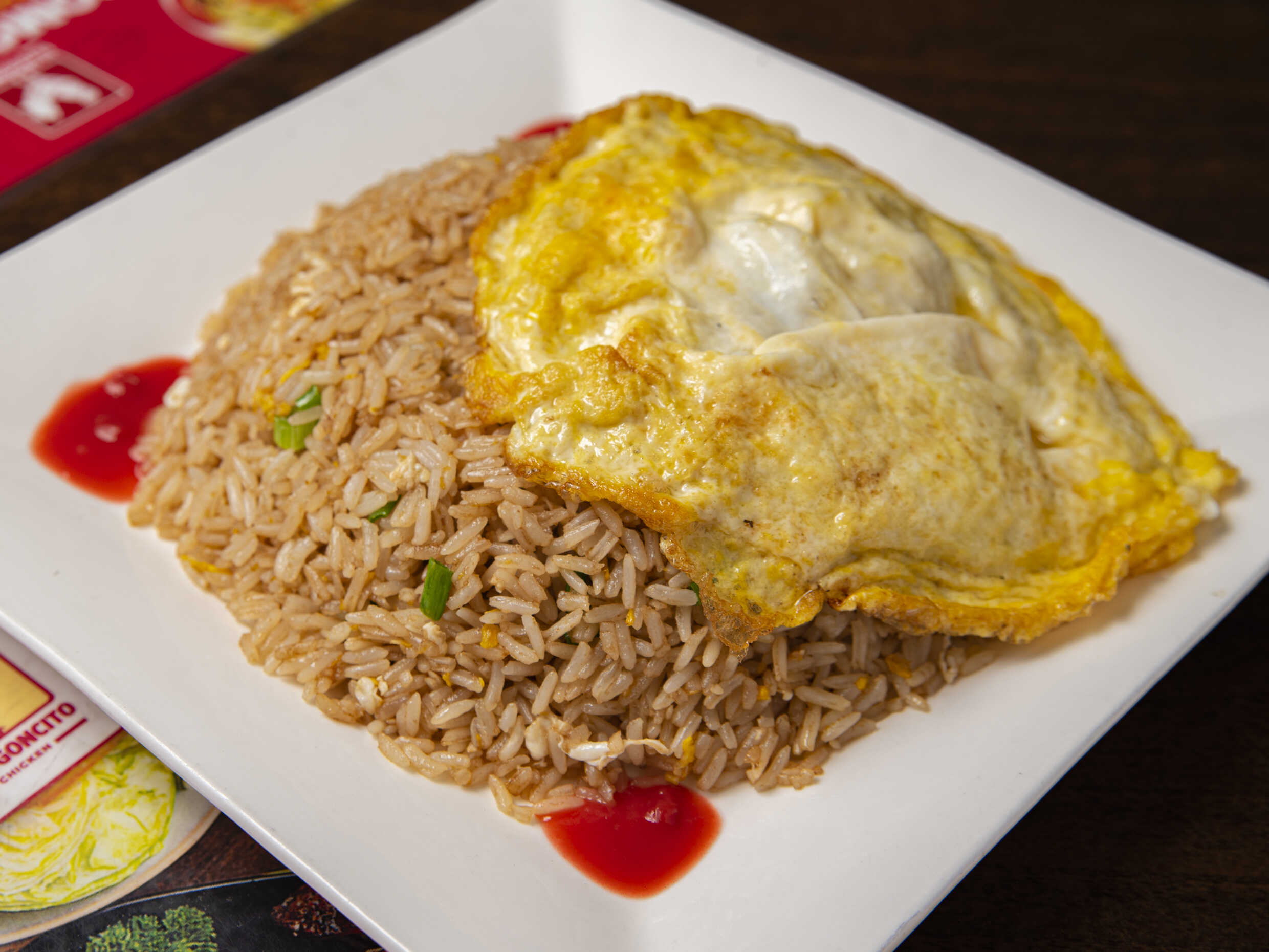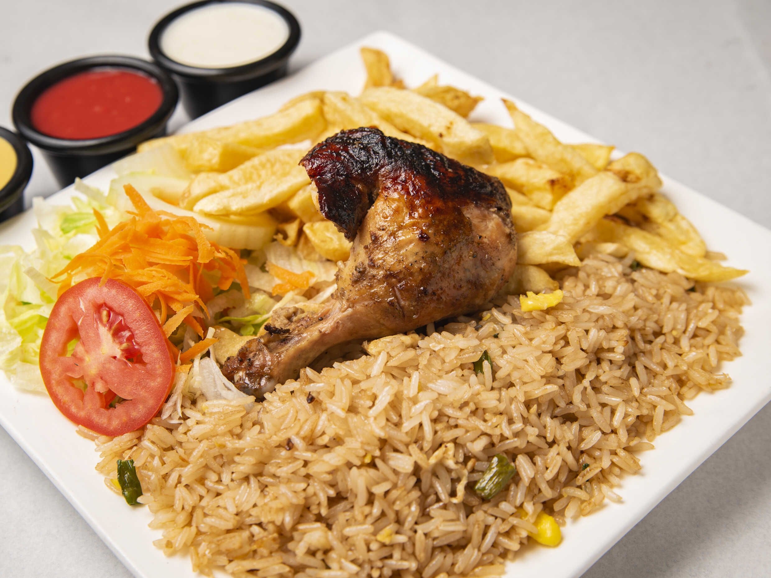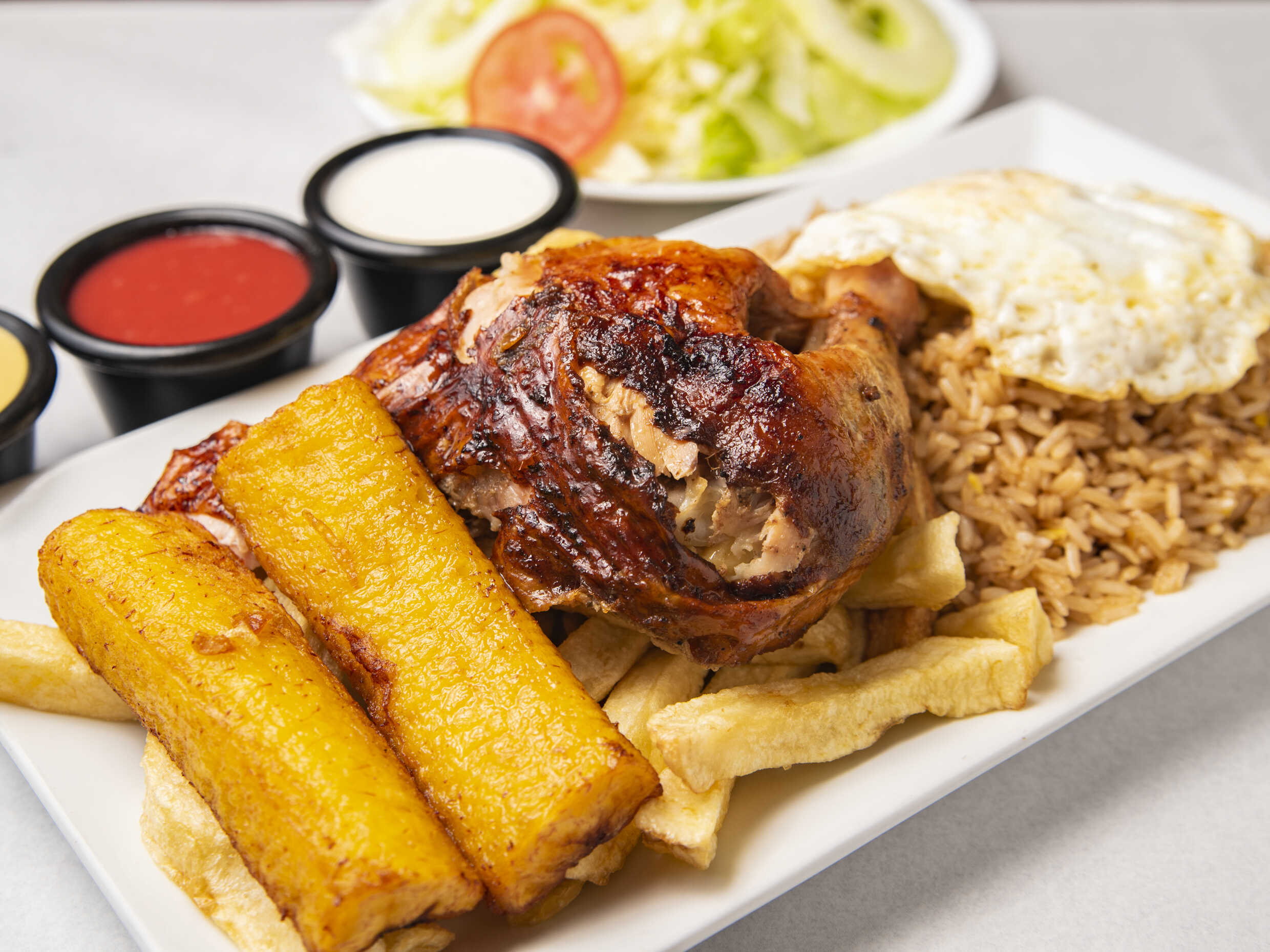 1/4 de pollo + chaufa , huevo y platano frito + ensalada y cremas.