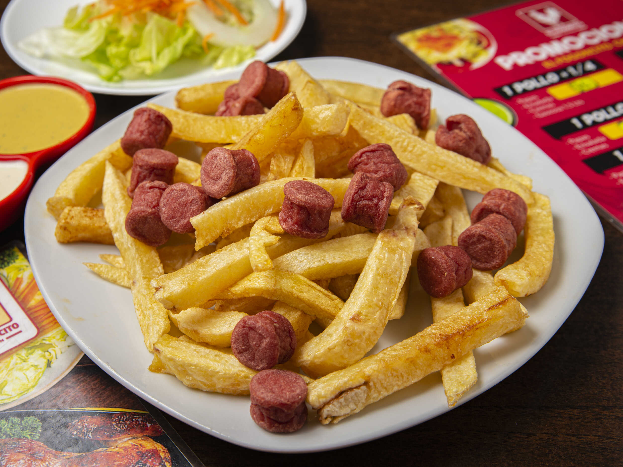 1/4 DE POLLO + 1 HOT DOG + PAPA FRITA + ENSALADA Y CREMMAS.