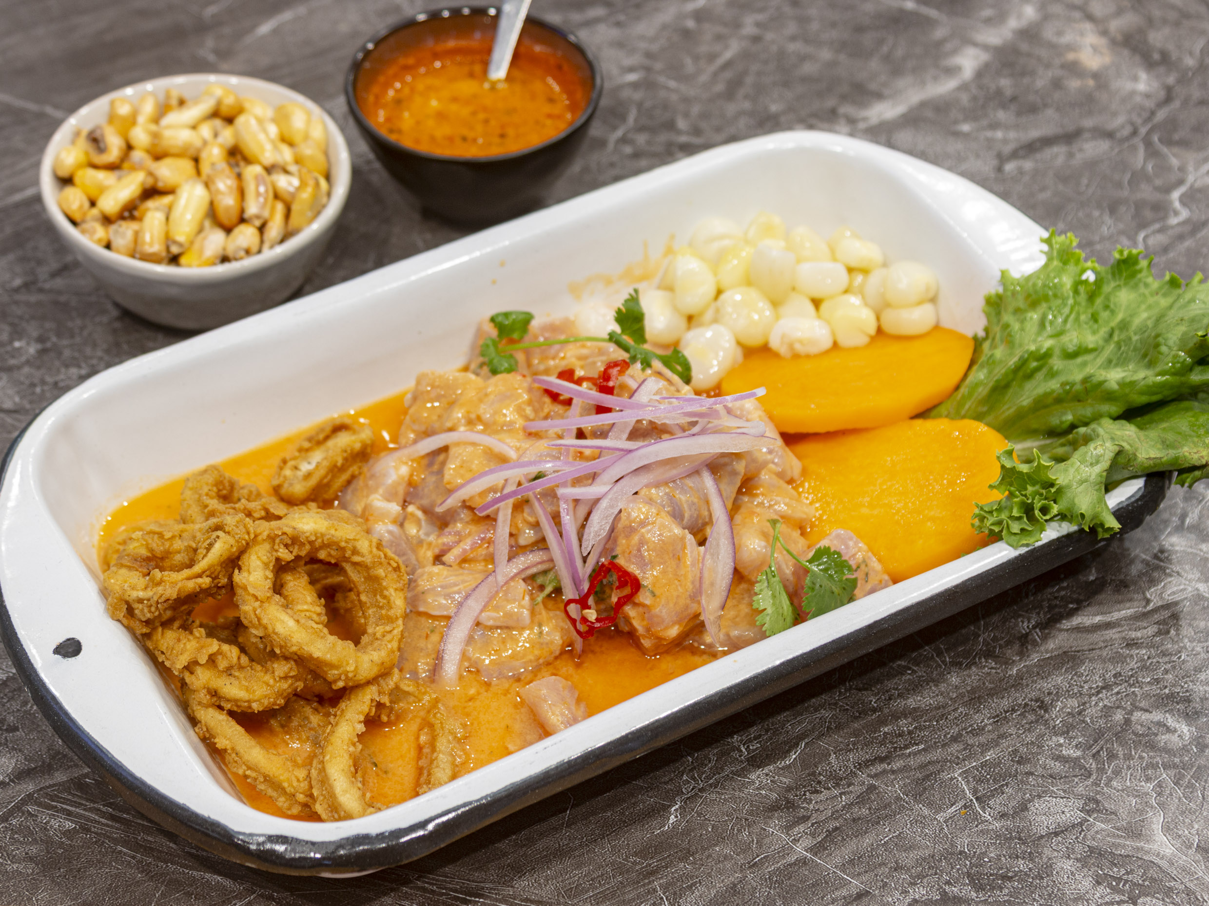 Nuestro tradicional ceviche servido con chicharrón de calamar y shot de leche de tigre.