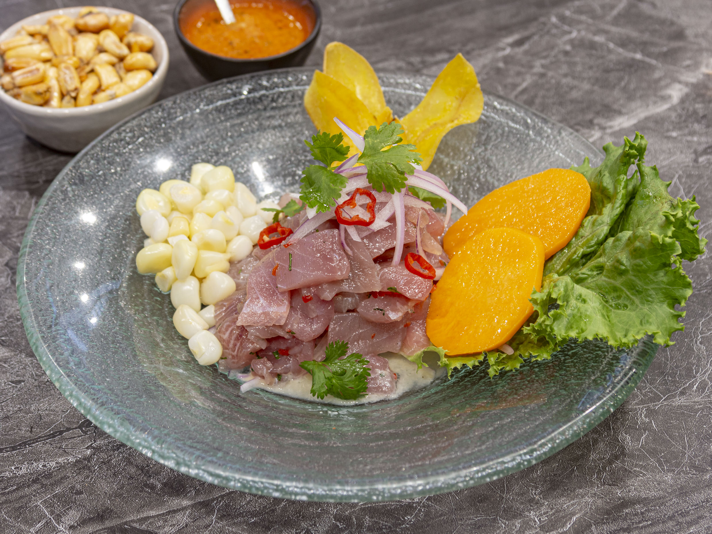 Una deliciosa fusión de texturas, donde el crujiente de la masas se combina con el fresco sabor de ceviche.