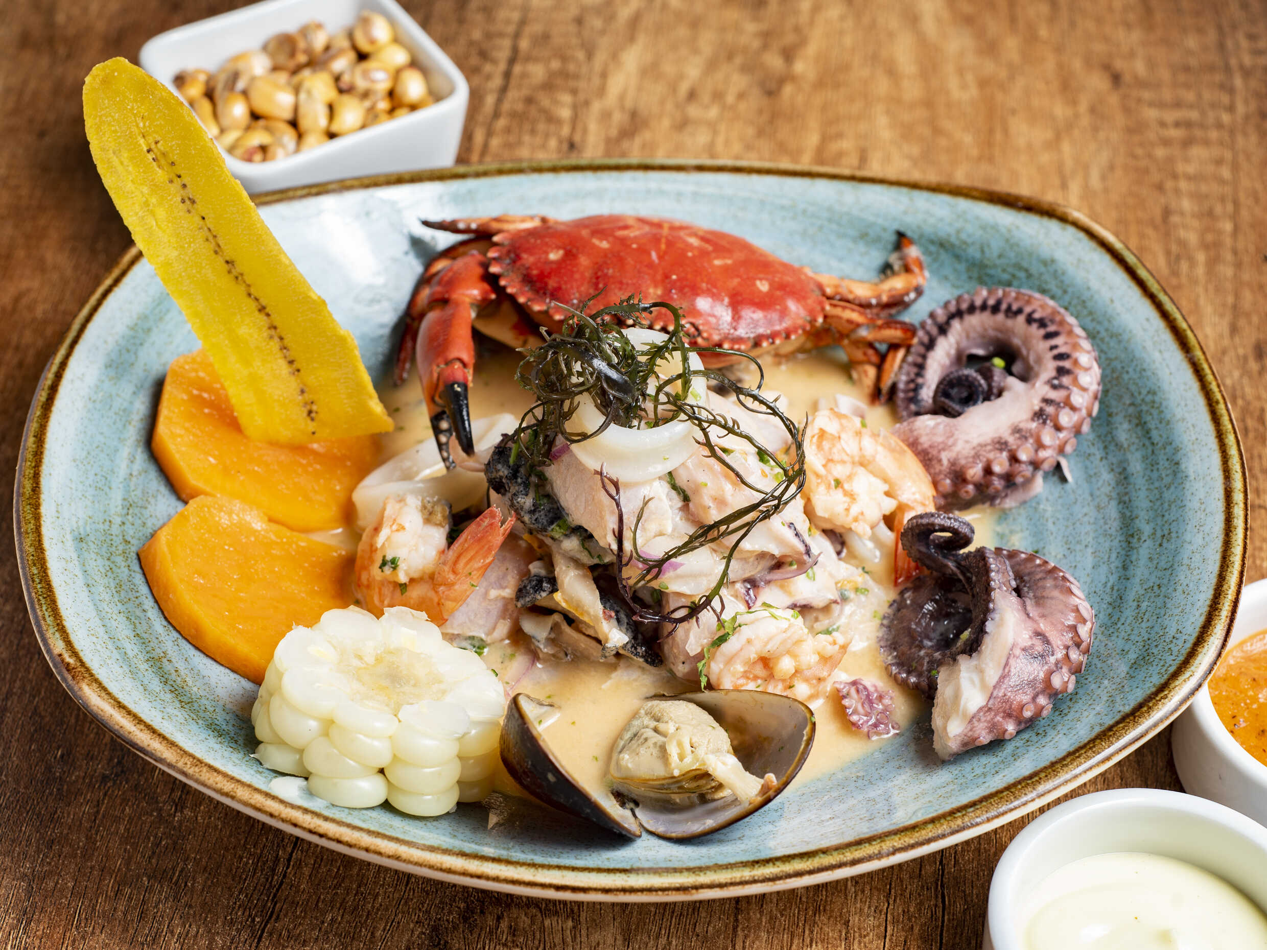 Festín marino, todo el mar en un solo plato: pescado entero, calamar, conchas , langostinos, pulpo, cangrejo, acompañado de yucas y sarza criolla.