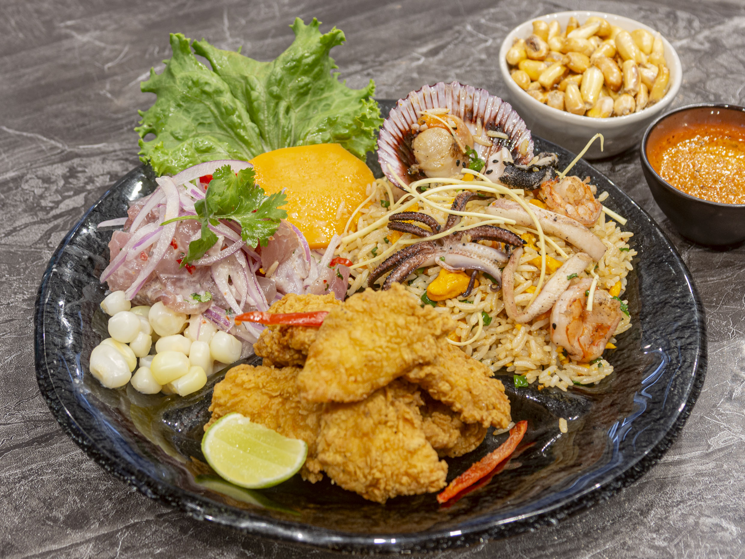 Ceviche, chaufa de mariscos y chicharrón de pescado.