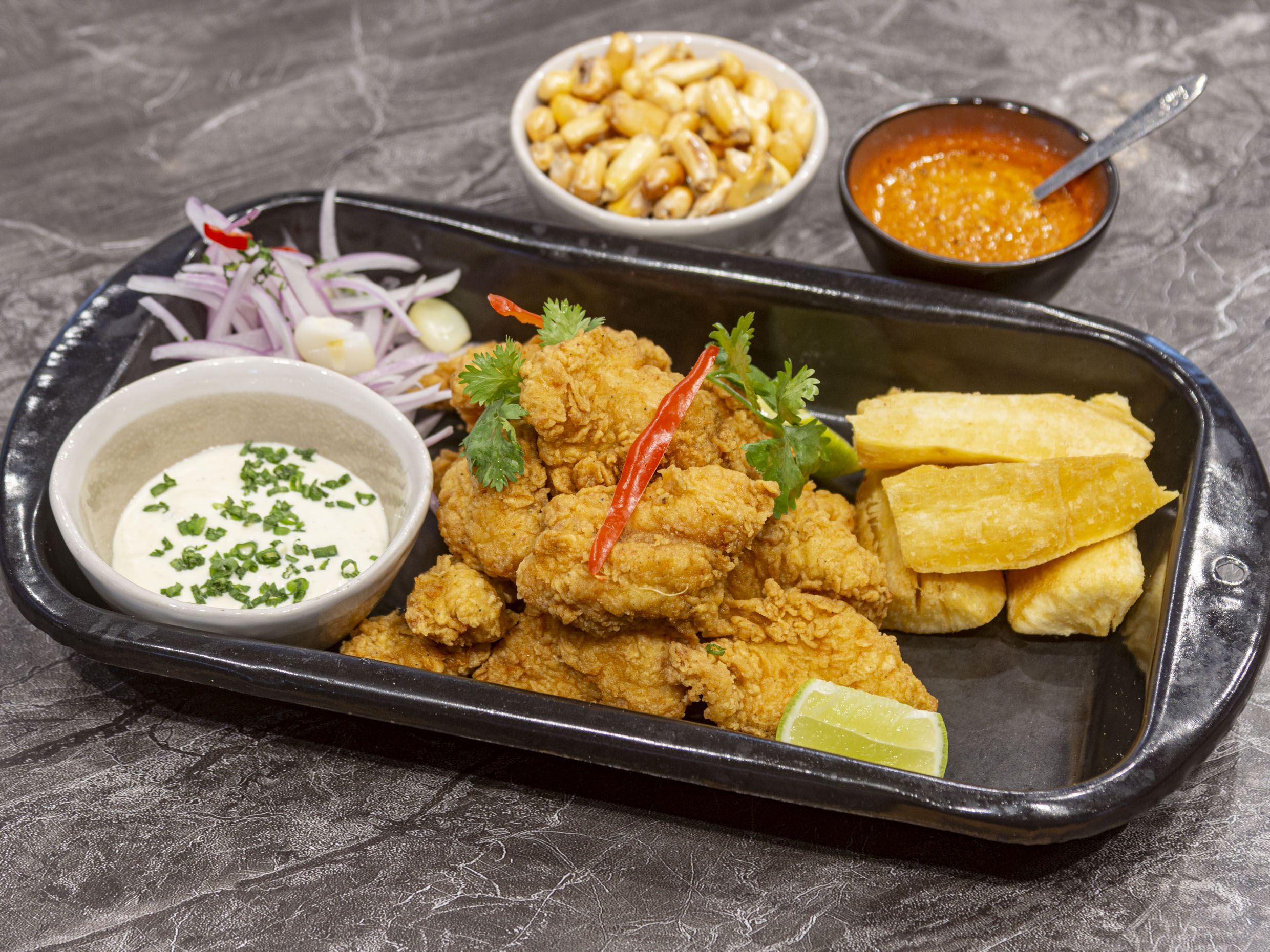 Filetes de pescado rebozados y fritos hasta dorarse, acompañados de yucas doradas y sarza criolla, una opción crujiente y sabrosa, ideal para compartir..