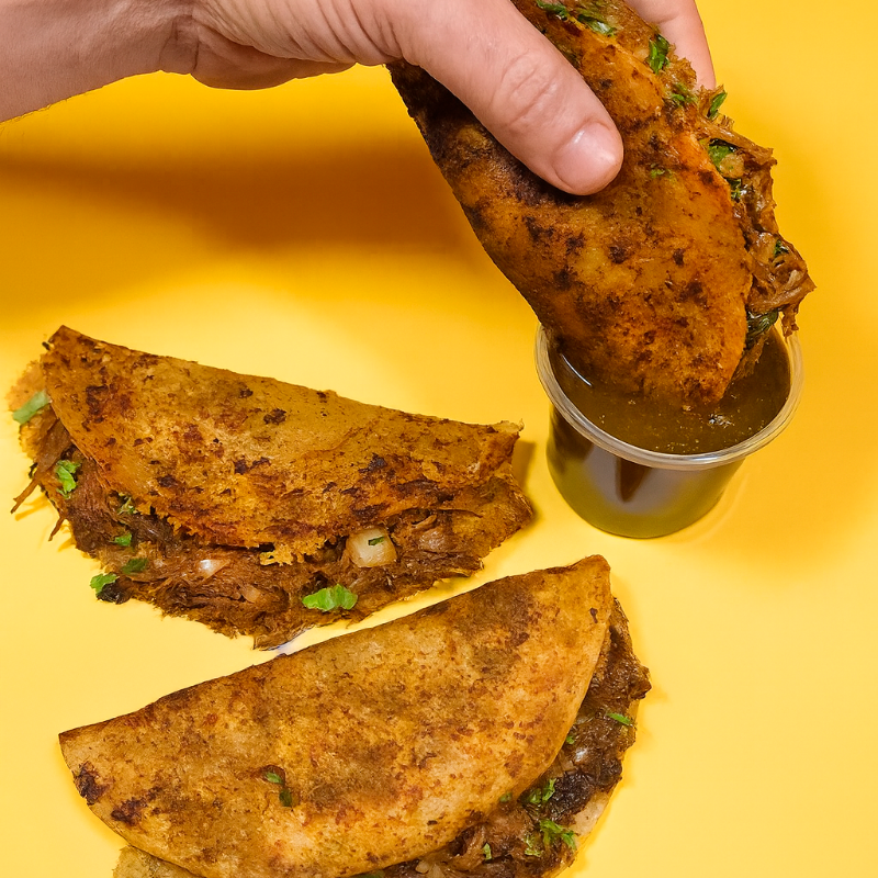 Doble tortilla de maíz, queso Oaxaca, carne de birria bañada en consomé de seco, salsa mexicana, cebolla y culantro, acompañada con su caldo fusión de birria de seco.