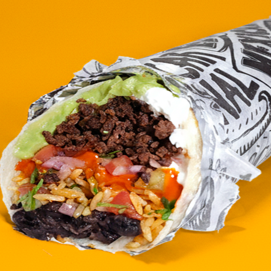 Tortilla de trigo, ground beef (carne molida guisada tex mex), salsa mexicana, culantro, guacamole, crema agria, frijol negro, arroz mexicano, cebolla caramelizada y pico de gallo.