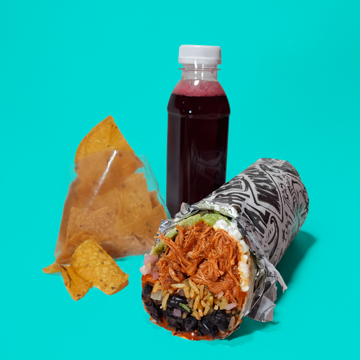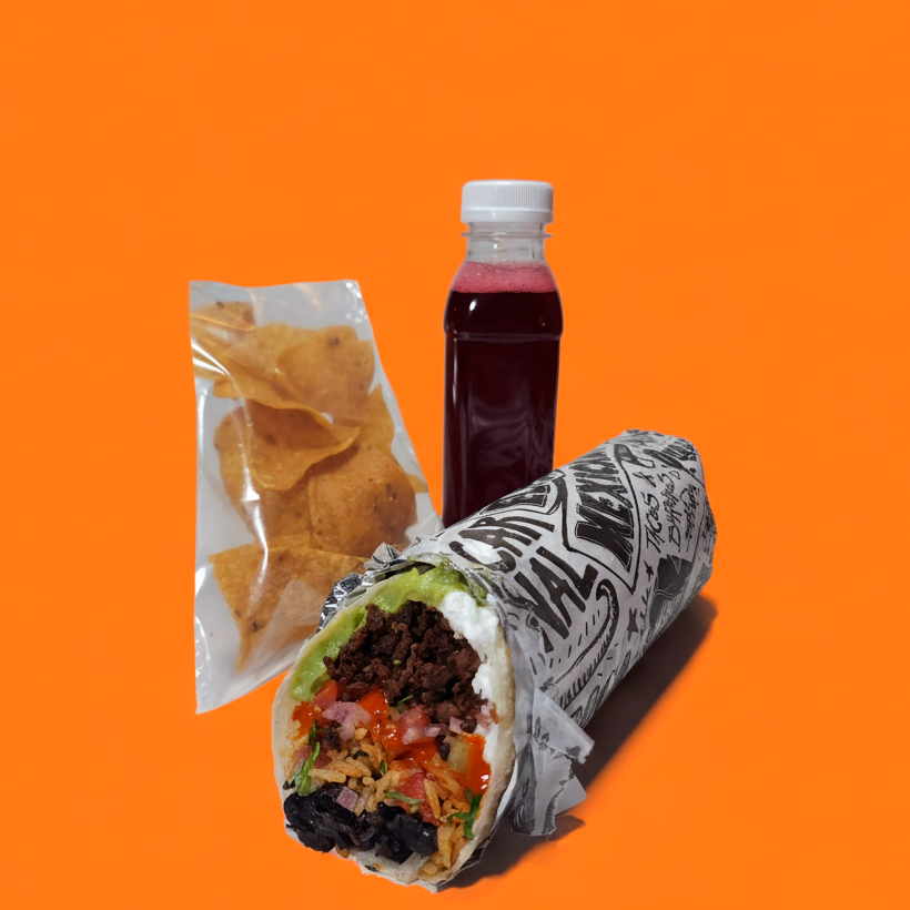Tortilla de trigo, ground beef (carne molida guisada tex mex), salsa mexicana, culantro, guacamole, crema agria, frijol negro, arroz mexicano, cebolla caramelizada y pico de gallo. incluye nachos cup y bebida Jamaica personal 500 ml.