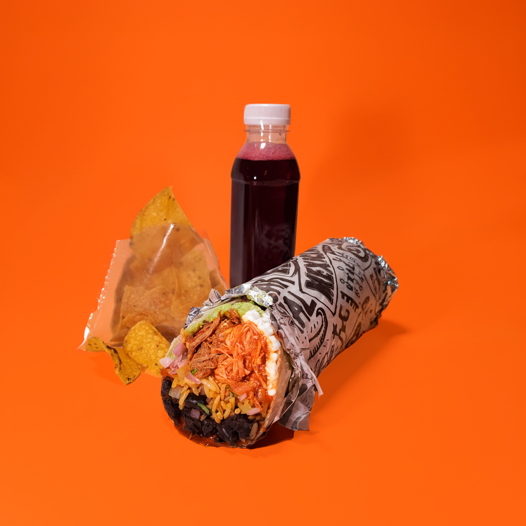 Tortilla de trigo, doble pollo veracruzano, salsa mexicana, guacamole, crema agria, frijol negro, arroz mexicano, cebolla caramelizada, pico de gallo, culantro nachos personales y agua de Jamaica 500 ml.