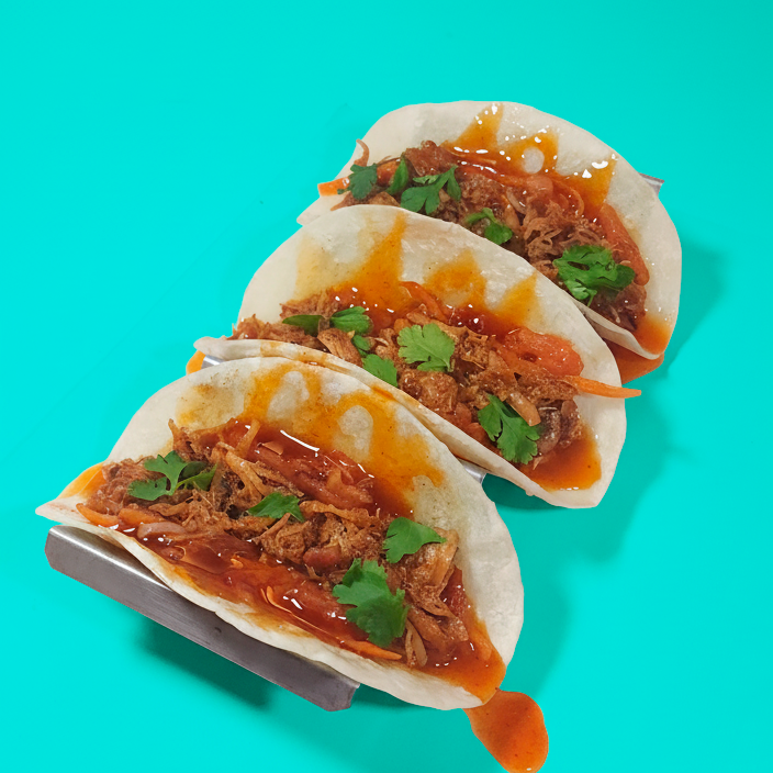 Tortilla de trigo, saltado limeño, cochinita pibil caramelizada en salsa agridulce chifera, culantro y limón.