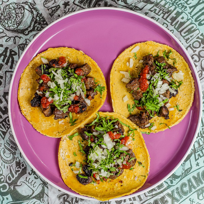 3 Tacos mex (1 carne a elección), nachos cup más salsas.