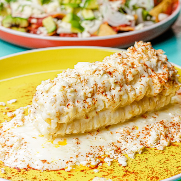 Choclo bañado en mayonesa, queso fresco y polvo de chiles no picante.