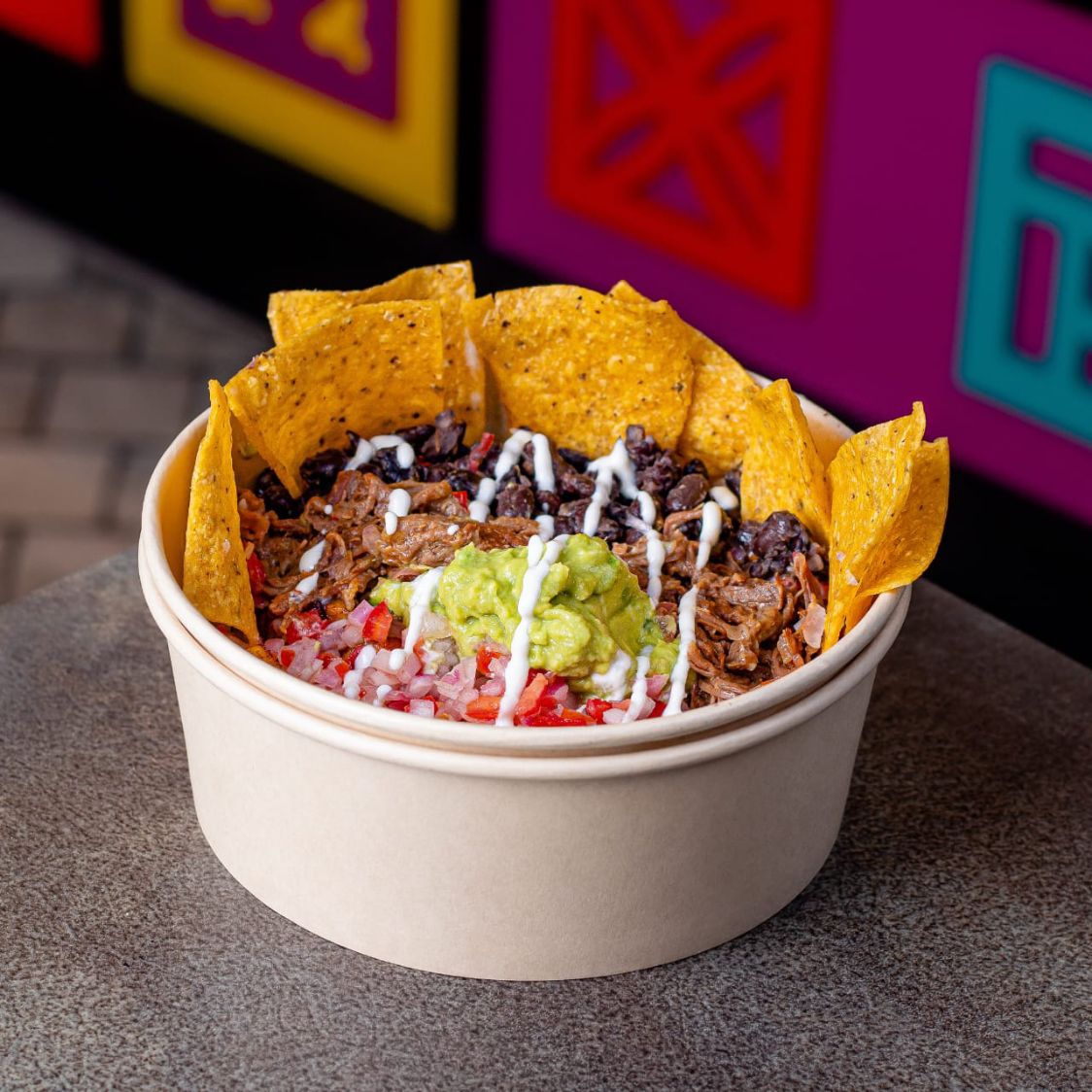 Base de arroz mexicano con ground beef, frijoles, 8 unidades de nachos, plátano frito, queso edam, crema agria, guacamole y salsas taqueras.