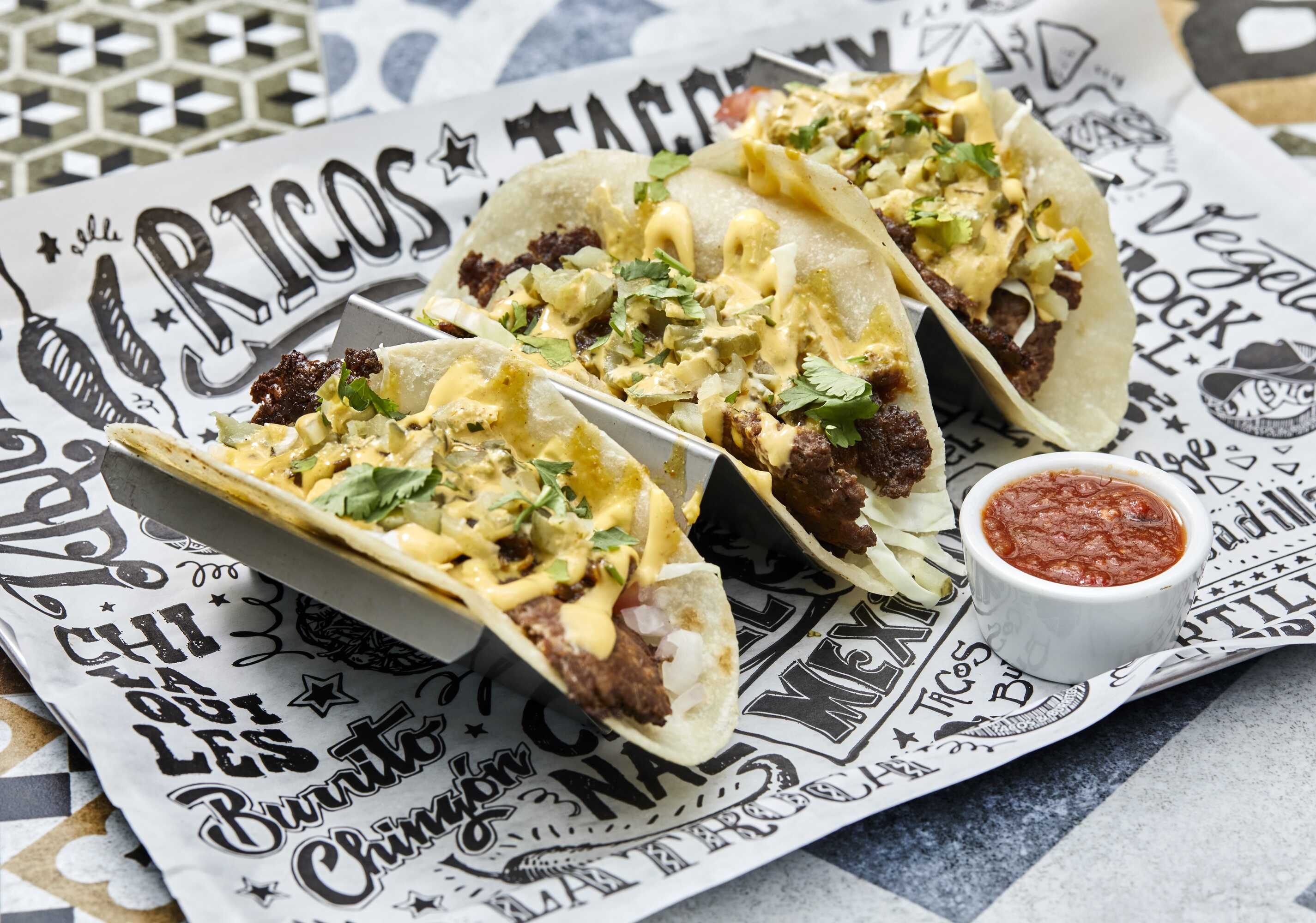 3 Tacos mex de barbacoa de pollo, 3 tacos burger, 3 gringas de pastor y nachos.
