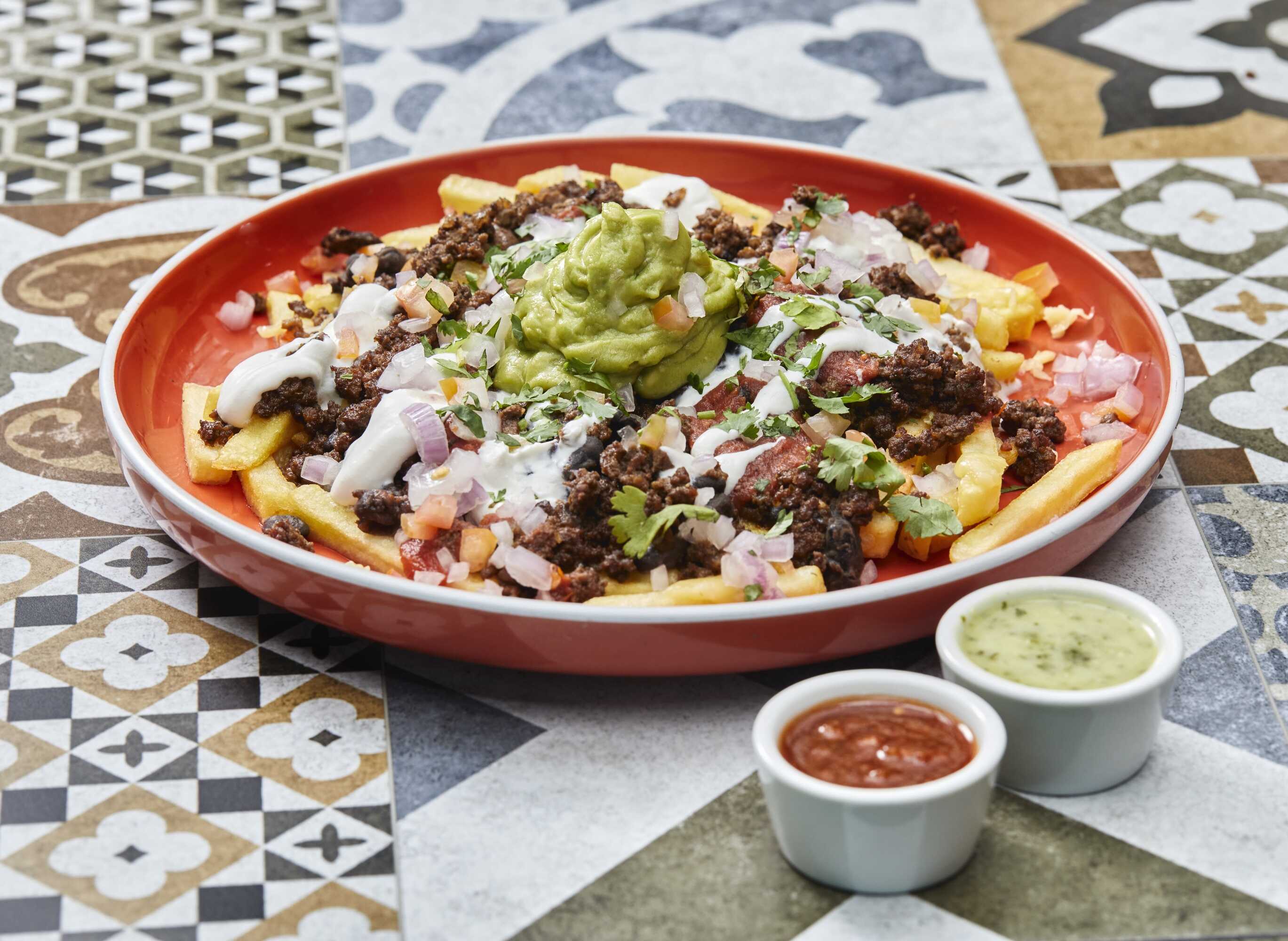 Papas fritas, ground beef, queso fundido, guacamole, salsa taquera, crema agria, frijol negro, pico de gallo y culantro.