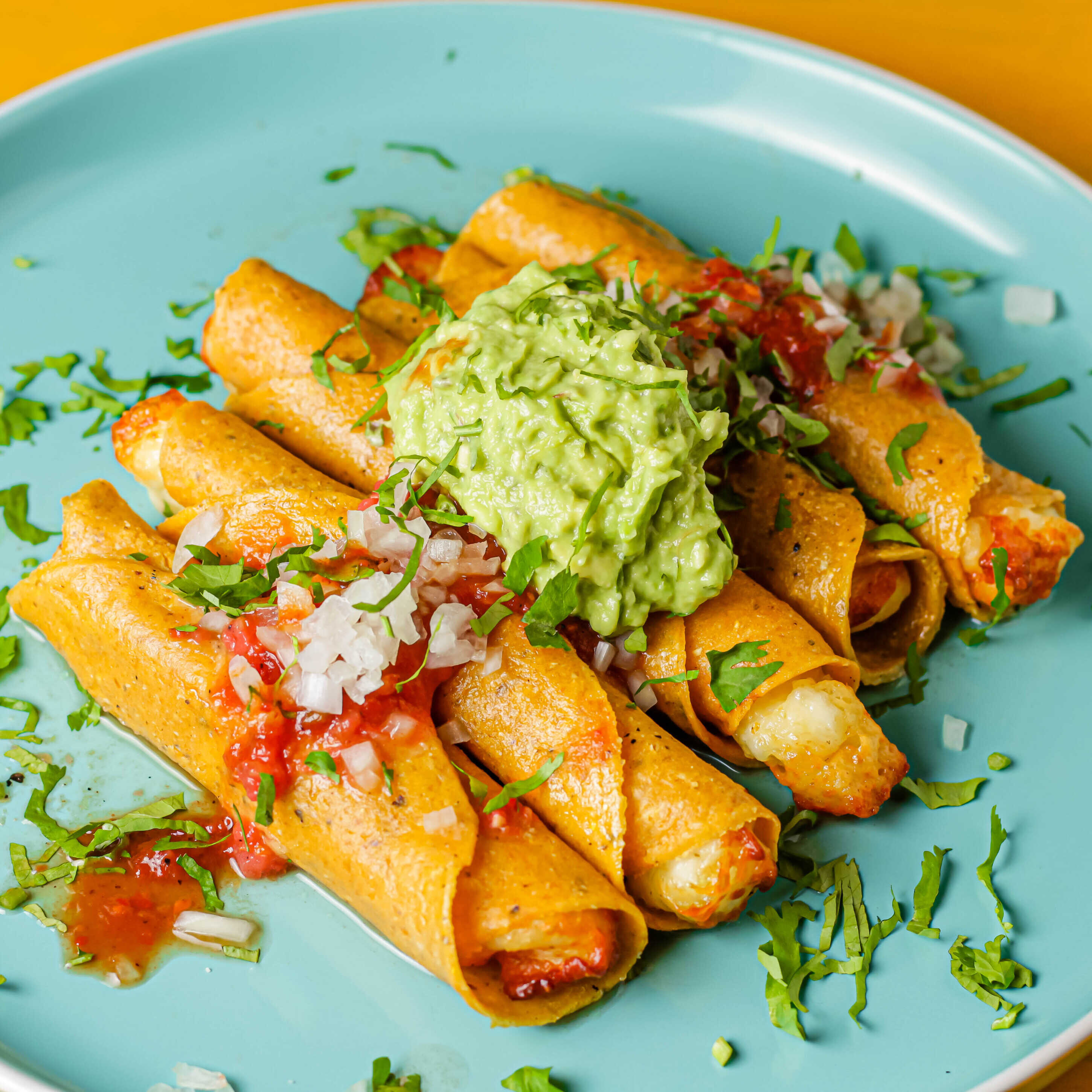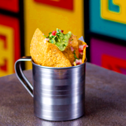 5 Tortillas de maíz crujiente, queso fresco, guacamole, salsa taquera, cebolla blanca, culantro y 2 salsas (1 chipotle, 1 salsa verde).