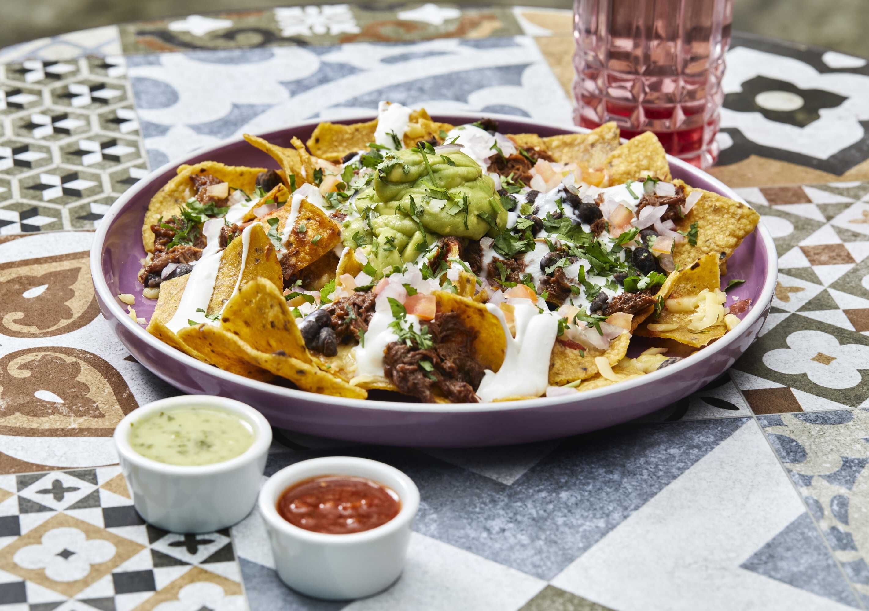 Nachos, ground beef, queso edam, guacamole, salsa taquera, crema agria, frijol negro, pico de gallo, culantro.