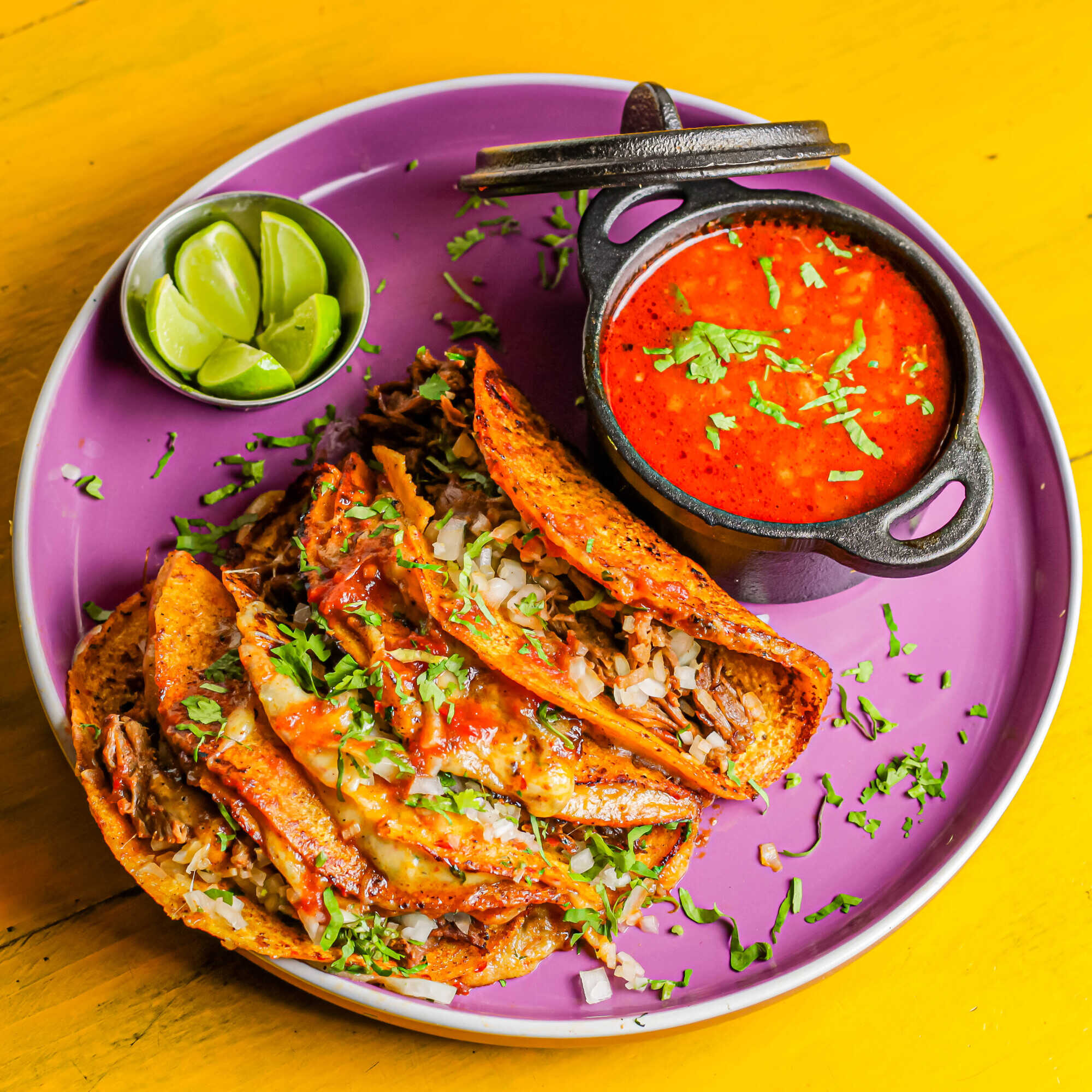 Tortilla de trigo, birria de res, queso edam y caldo de birria