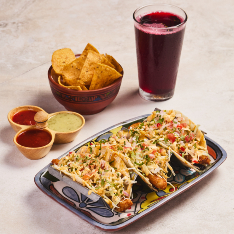 3 Tortillas de maíz (elige proteína), salsa taquera, crema agria, crema de frijol, guacamole, pico de gallo, culantro, 2 salsas (1 chipotle, 1 salsa verde), nachos y bebida a elección (10 oz).