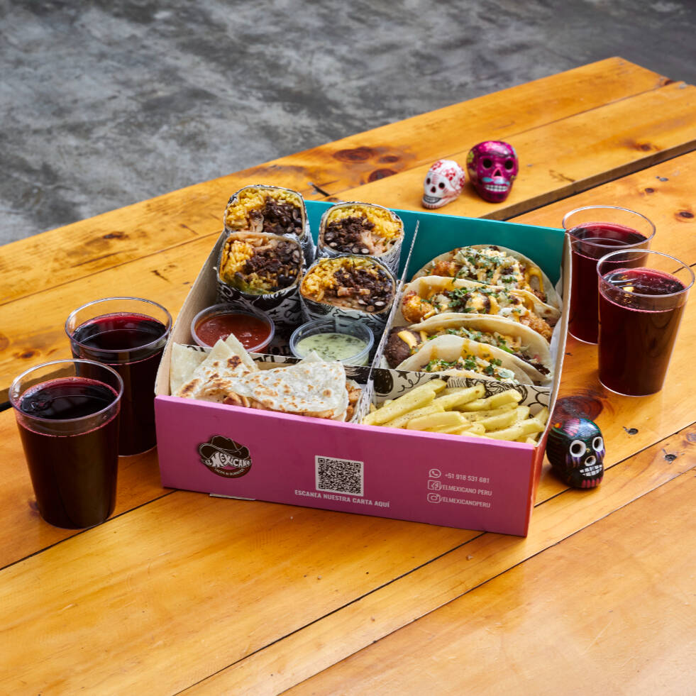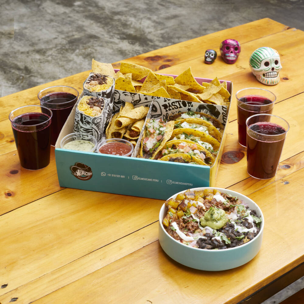 3 Tacos mex barbacoa de pollo, 3 tacos mex barbacoa de res, 1 bowl chingón express ground beef, 1 burrito carnalito de barbacoa de res + 4 flautas, 4 porciones de nachos y 4 bebidas a elección de 10 oz.