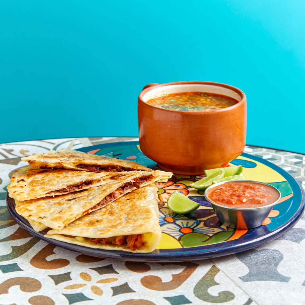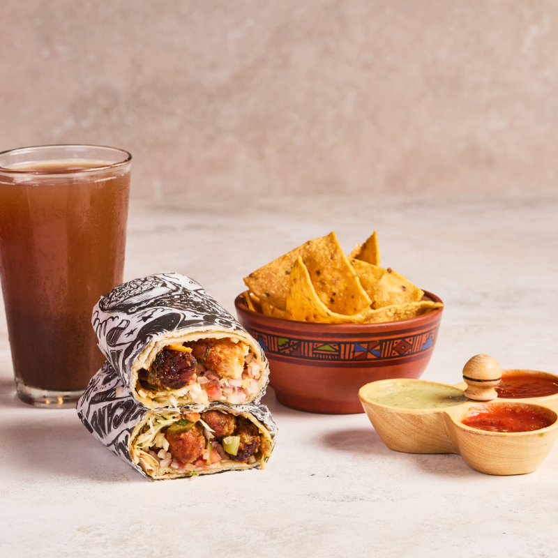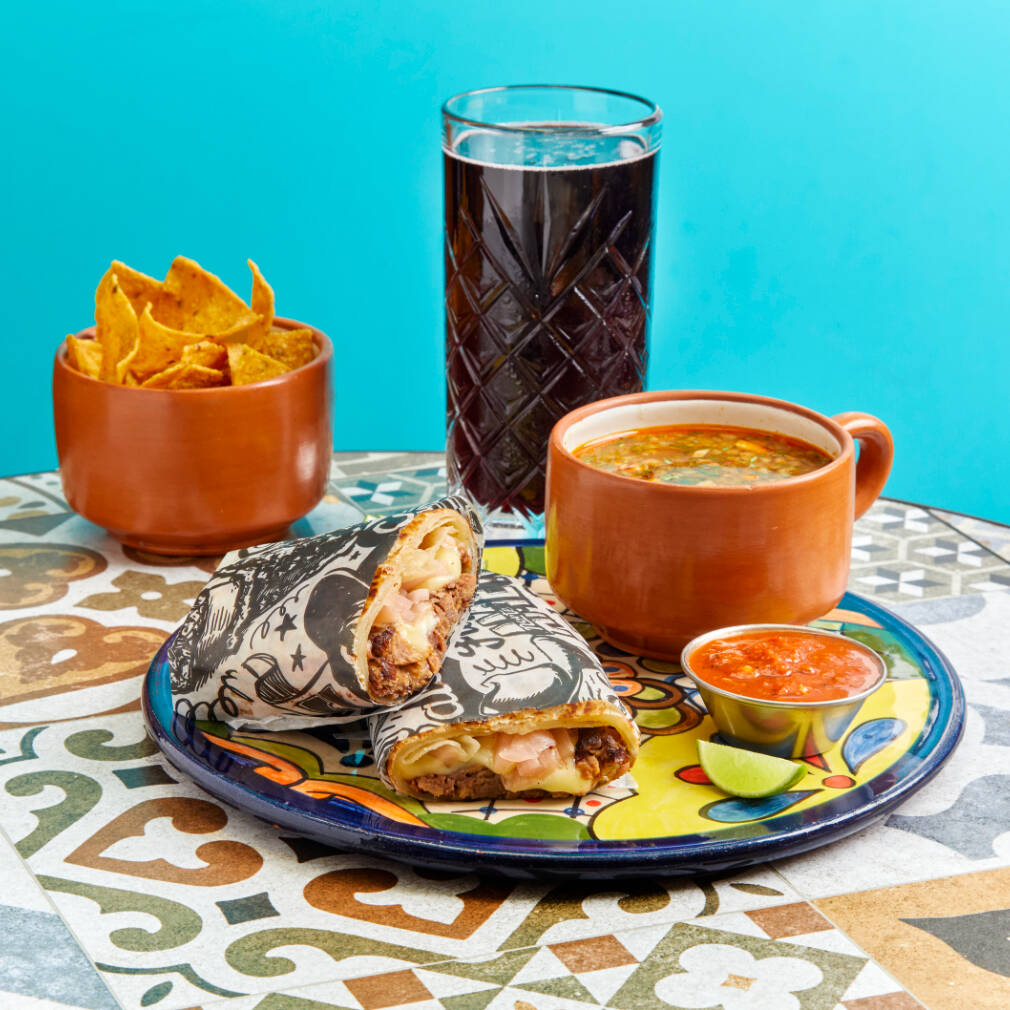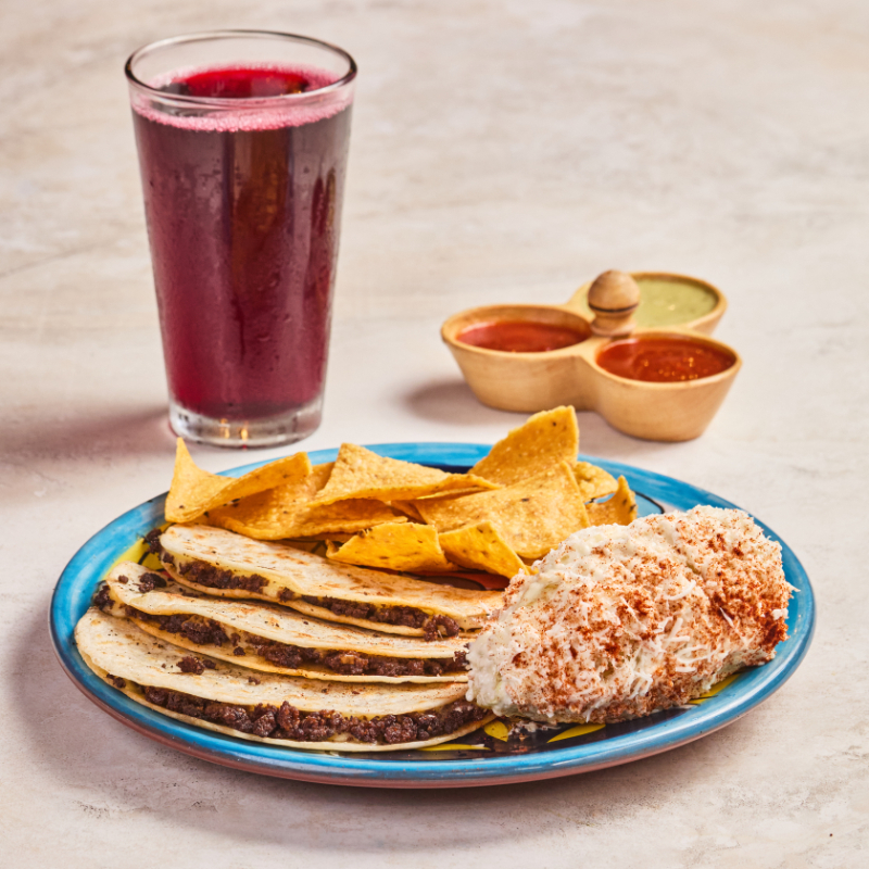 Tortilla de trigo, 1 proteína a elección, queso oaxaca, cebolla blanca, culantro, 2 salsas (1 chipotle, 1 salsa verde), nachos y bebida a elección (10 oz).