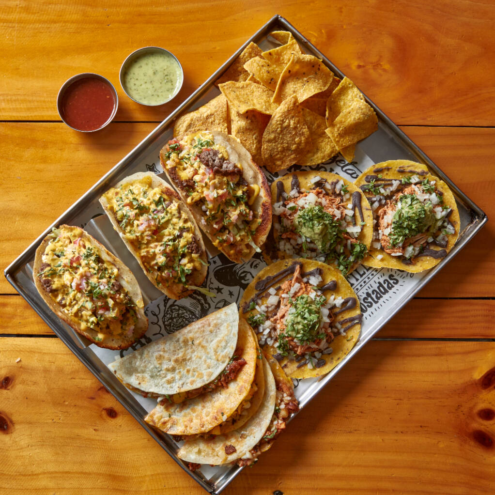 Tortilla de trigo con relleno al gusto, salsa taquera, guacamole, crema agria, queso edam, cebolla blanca, arroz, frijol negro, limón, pico de gallo, nachos y bebida a elegir.