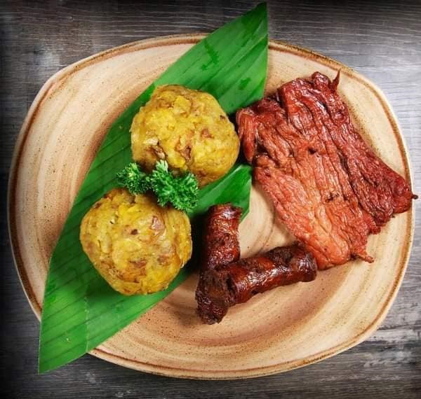 Tacacho a base de plátano: 2 bolas de tacacho con chorizo ahumado de 100 g, filete de cecina y su ajicito de cocona.