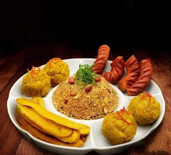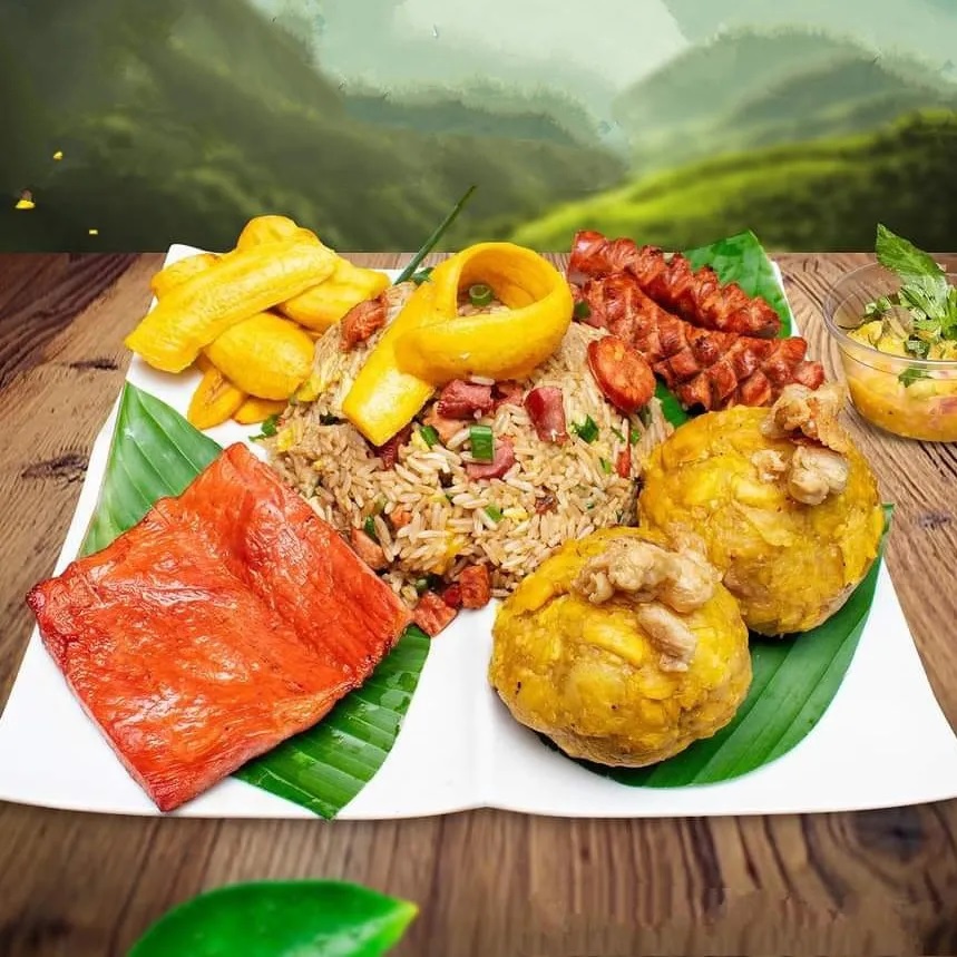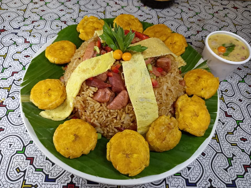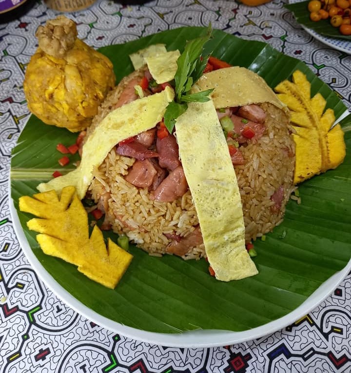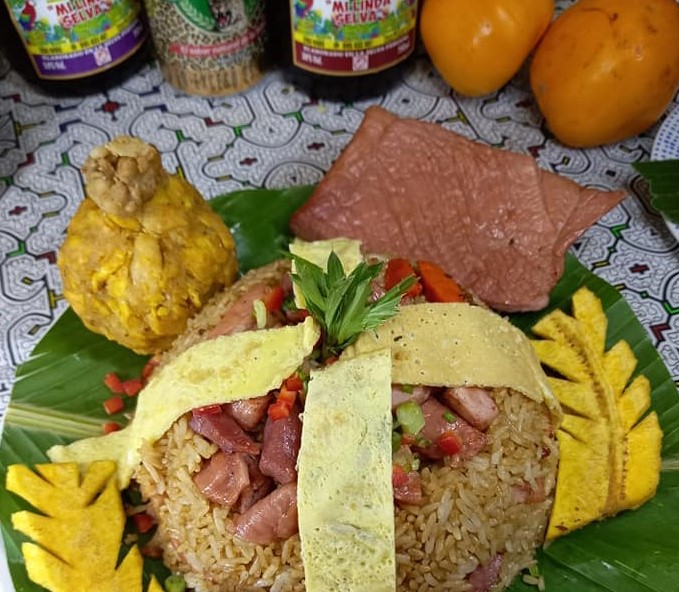 Base de chaufa amazónico de 300 g, 2 tacachos, 2 cecinas de 100 g, 2 chorizos ahumados y 4 plátanos fritos, acompañados de su ajicito de cocona.