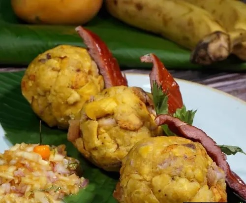 Tacacho a base de plátano: 2 bolas con filete de cecina ahumada y ají de cocona.
