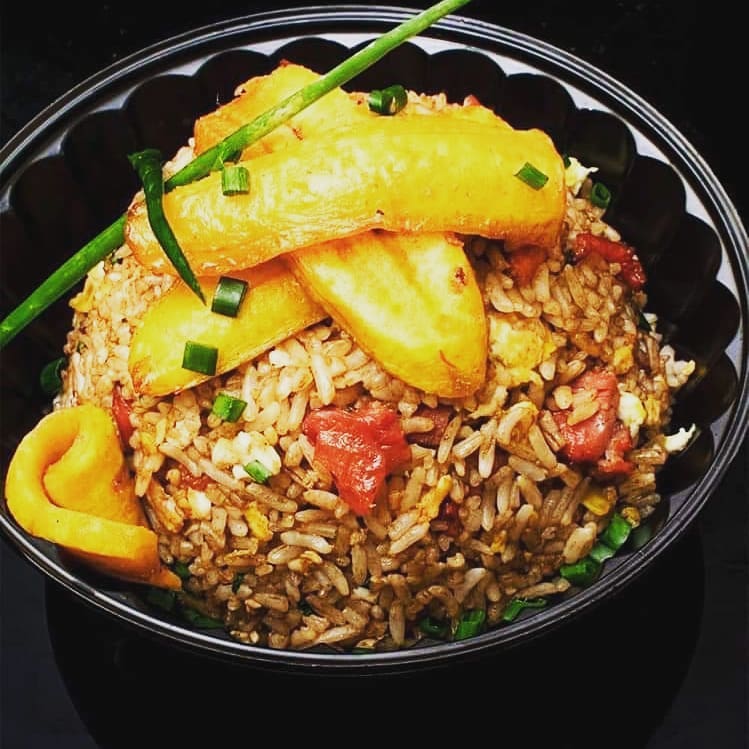 Arroz chaufa de chorizo ahumado de 100 g con pimentón, cebollita china, huevo, plátano frito y ají de cocona.