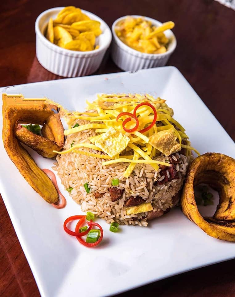 Arroz chaufa de cecina de 100 g, chorizo ahumado de 100 g, pimentón, cebolla china, huevo, bola de tacacho, ají de cocona y plátano frito.