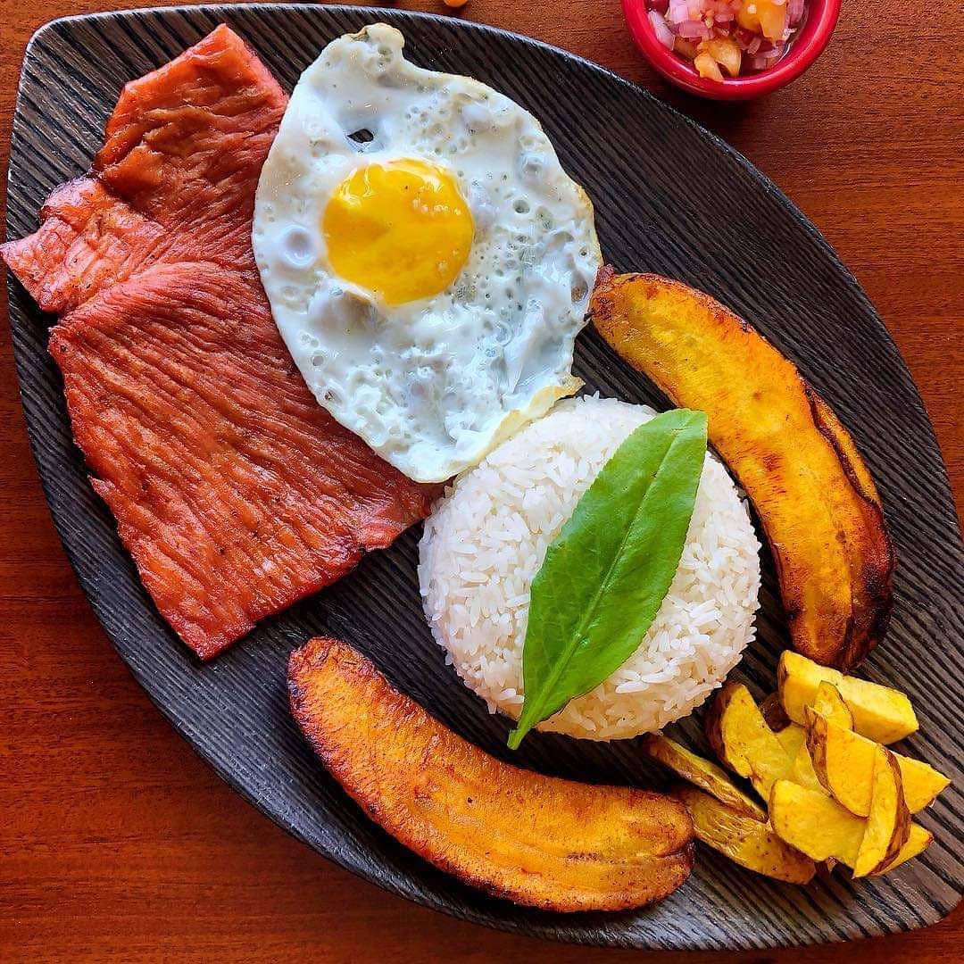 Cecina ahumada 100 g, huevo frito, plátano frito y arroz, acompañada de su ajicito de cocona.