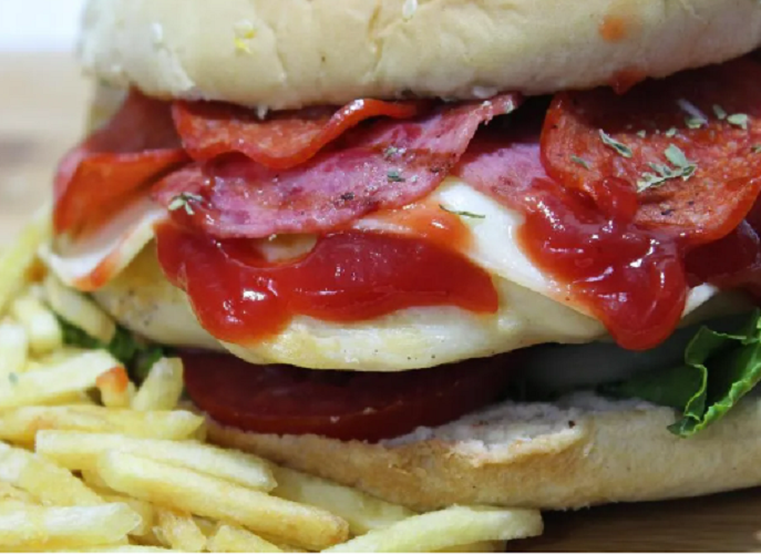 Pan hamburguesa, hamburguesa de la casa 200 g bañada de kétchup y sus toques de orégano, queso blanco, pepperoni y salamis en rodajas, tomate y lechuga con papitas al hilo.