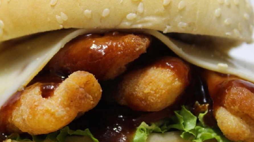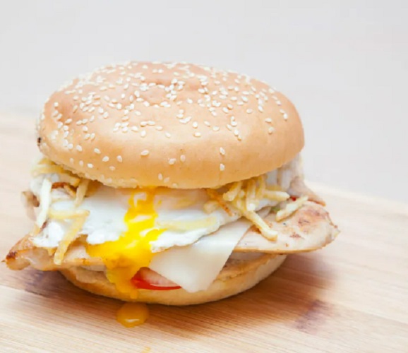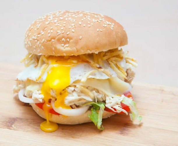 Pan de hamburguesa, milanesa de pollo, huevo frito, queso blanco, lechuga y tomate.