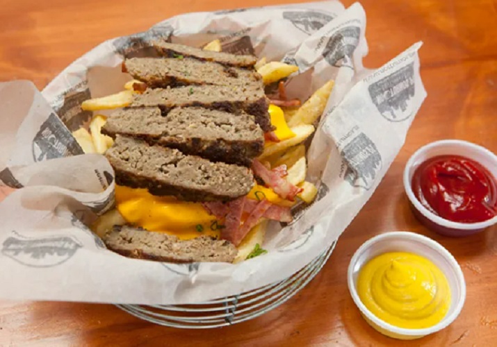 Papas fritas, hot dog frankfurter, tocino y queso cheddar acompañado de cremas de la casa.