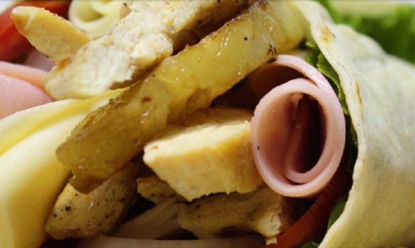 Pollo a la plancha, huevos revueltos, jamón, queso blanco, papa al hilo, lechuga y tomate envueltas en tortillas de harina de trigo.