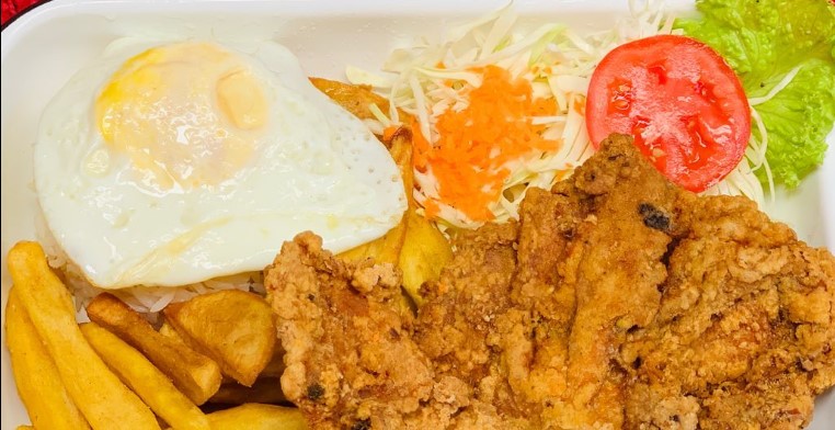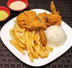 Broaster, papa frita, arroz blanco, ensalada fresca y cremas.