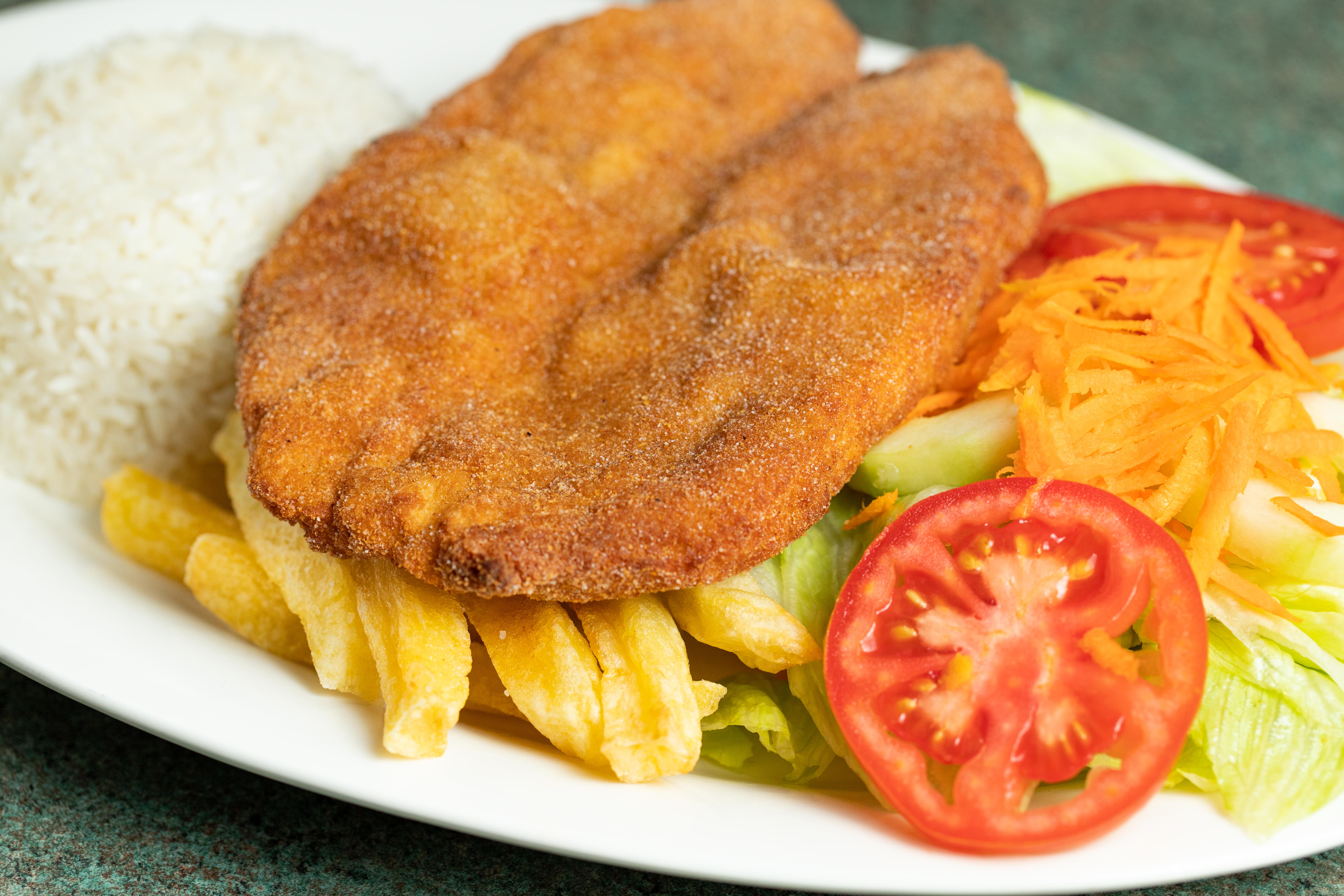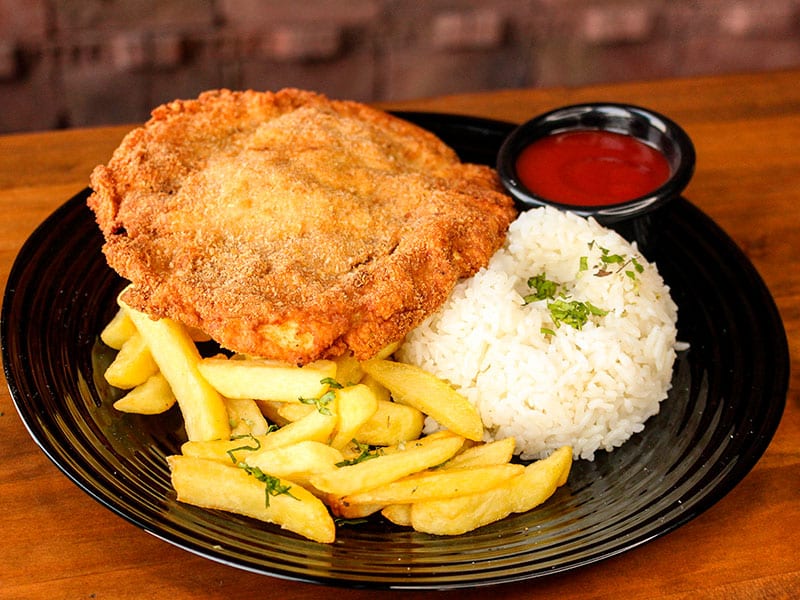 FILETE DE PECHUGA BROSTER, PAPA FRITA, ARROZ Y ENSALADA