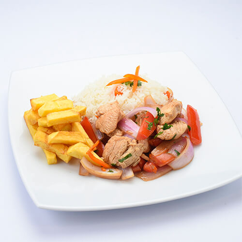 Trozos de lomo, cebolla, tomate, papas y arroz.
